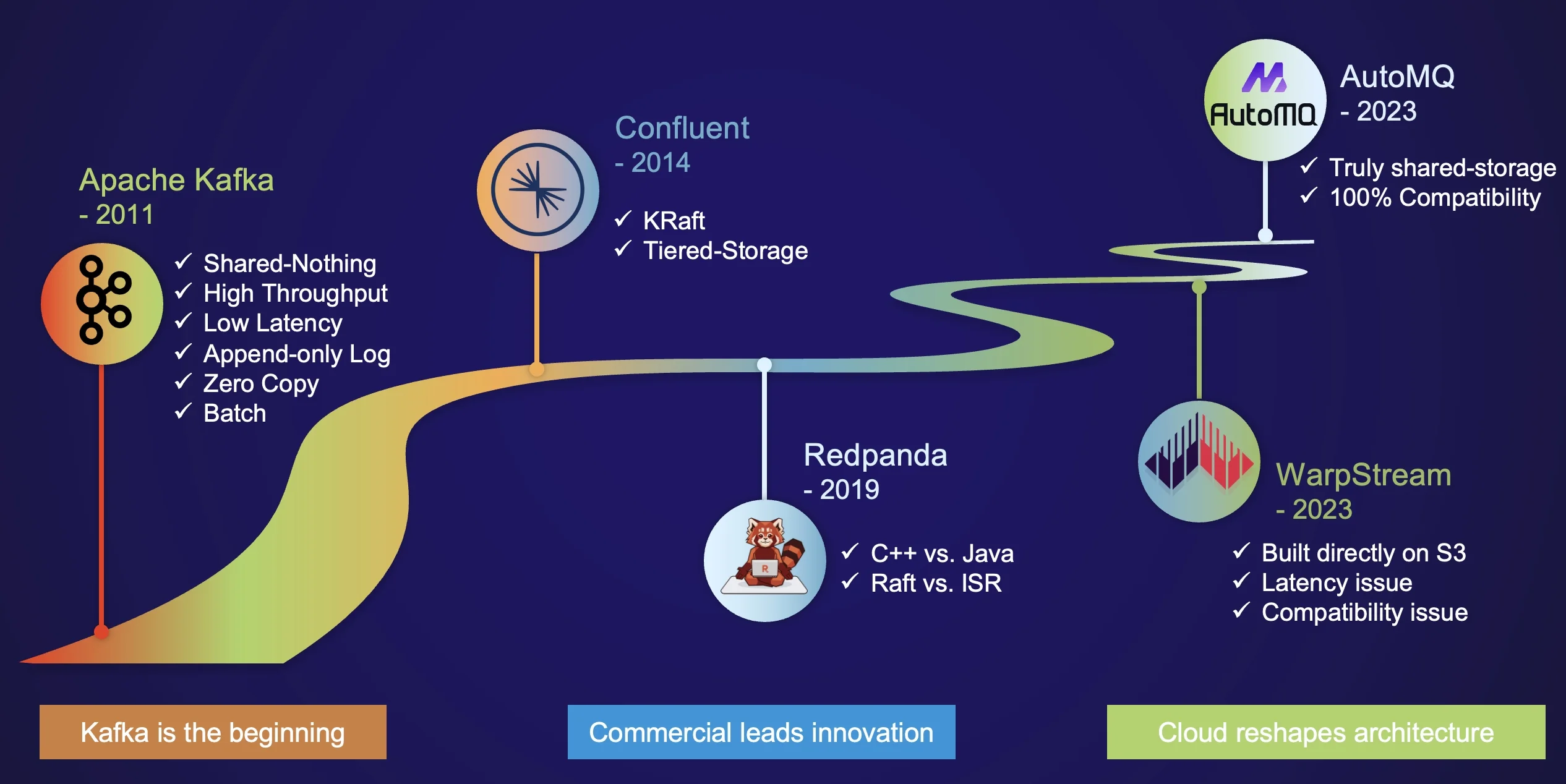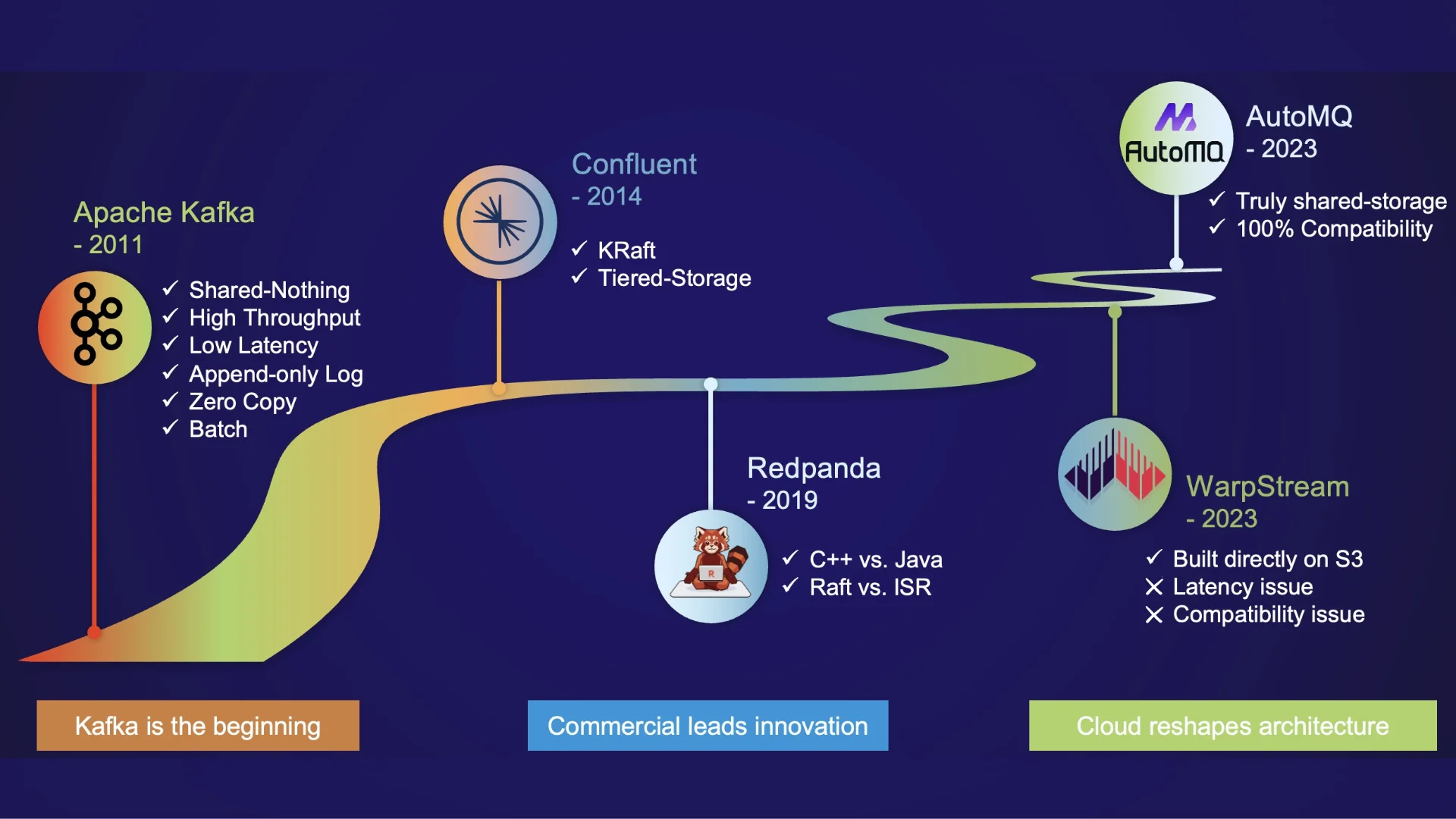 As the industry matured, commercial opportunities began to surface. Companies like Confluent and Redpanda emerged, driving technical innovations in the Kafka ecosystem. Confluent introduced significant architectural innovations, namely KRaft and Tiered Storage, which streamlined the architecture and substantially reduced storage costs. However, these innovations did not fully address Kafka's challenges, as the first level of storage still relied on ISR replication, resulting in issues like difficult partition reassignments, high IaaS costs, and limited scalability.