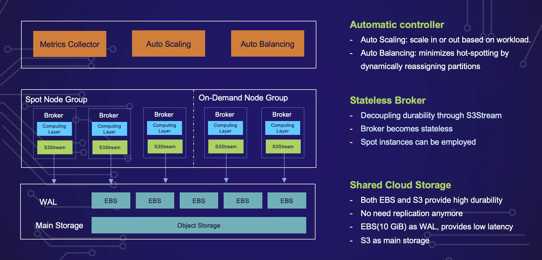 We have two automated controllers that collect key metrics from the cluster. The auto-scaling controller monitors the load of the cluster and decides whether to scale in or scale out the cluster. The auto-balancing controller minimizes hot-spotting by dynamically reassigning partitions across the entire cluster. This level of automation is integral to the flexibility and scalability of AutoMQ, and it is also the inspiration behind its name.