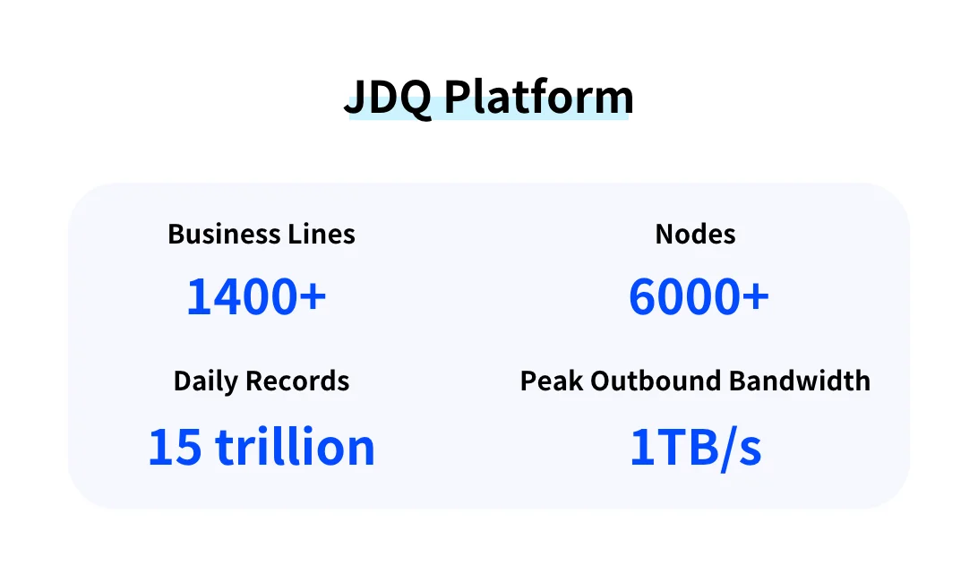 JD internally utilizes JDQ, which is built on Apache Kafka, to support its platform business. JDQ is the unified real-time data bus for JD Group's big data platform, enabling over 40 primary departments within the company, including JD Retail, Logistics, Technology, Health, and Allianz, to support more than 1400 business lines such as search recommendations, advertising, clickstreams, and real-time large screens. Currently, the JDQ platform consists of over 6000 nodes, generating up to 15 trillion records daily, with a peak outbound bandwidth reaching 1TB/s.