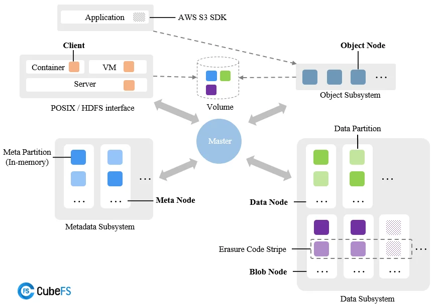 CubeFS is composed of the Metadata Subsystem, Data Subsystem, Master (resource management node), and Object Subsystem, providing storage data access via POSIX/HDFS/S3 interfaces.