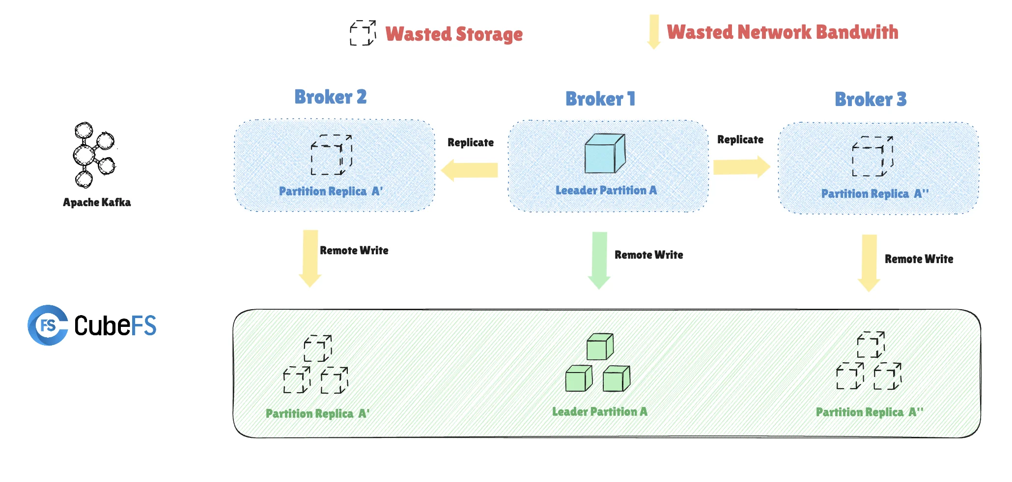 Data Offloading to Cloud Storage, Significantly Reducing Storage and Bandwidth Resources: AutoMQ's shared storage architecture is built on WAL and object storage, achieving a complete separation of compute and storage. Unlike Apache Kafka®'s ISR multi-replica mechanism, AutoMQ delegates data durability directly to object storage services like S3/CubeFS. This design results in only three replicas of data written to the Broker at the CubeFS level, significantly reducing storage resource consumption. With a single Leader Partition design, AutoMQ also saves the network bandwidth cost incurred by traditional Kafka Replica writing to remote CubeFS.