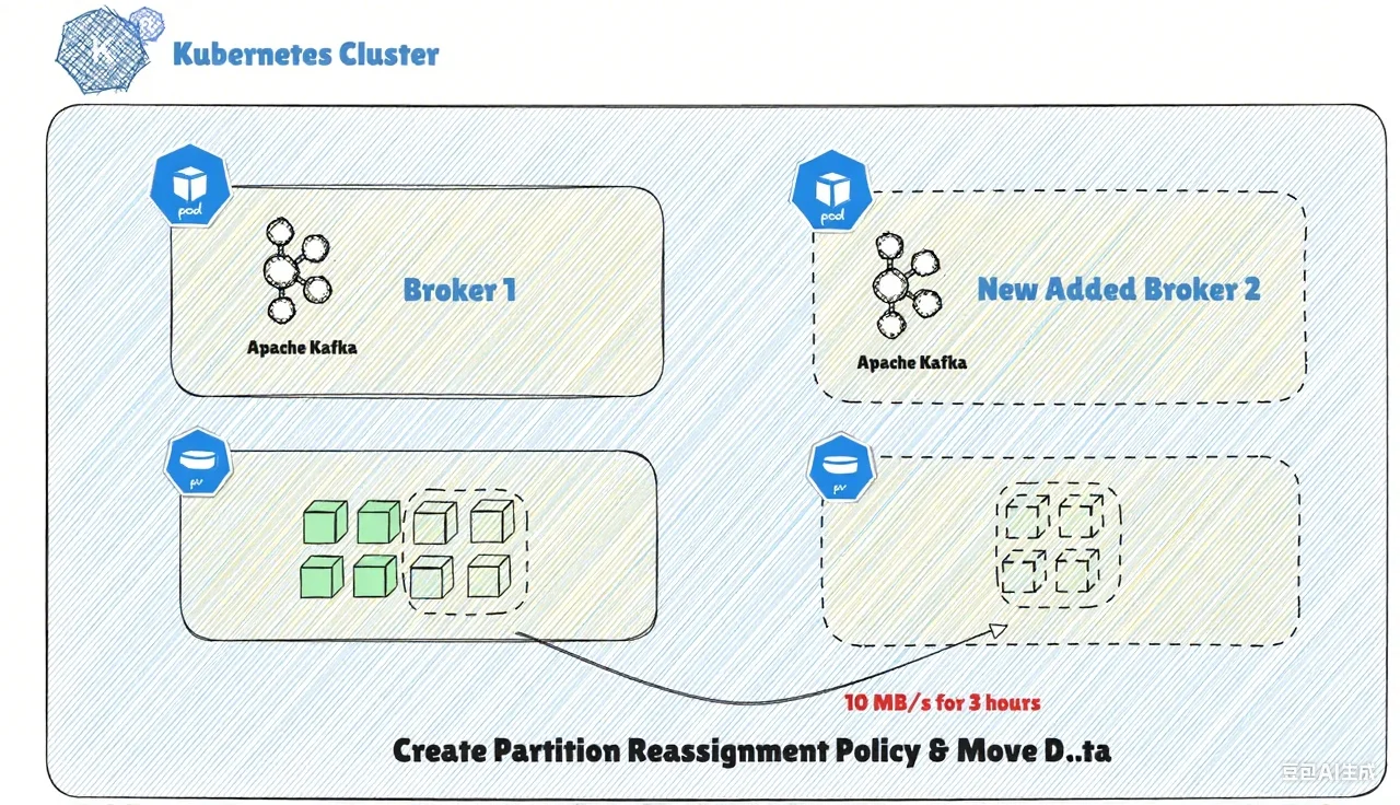 Apache Kafka employs a Shared-Nothing architecture that tightly couples its computing nodes (Brokers) with local storage, posing significant obstacles for flexible scaling on Kubernetes. For instance, during a scale-out, Apache Kafka must undergo the following steps: