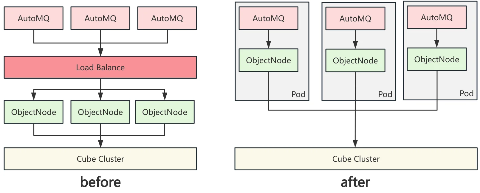 - CubeFS Object Node Service Deployment: CubeFS supports S3 protocol requests through its Object Node service, which interfaces externally. S3 protocol clients send requests to the Object Node service and receive responses without the S3 SDK communicating directly with CubeFS backend Meta Node and Data Node. JD.com's CubeFS Object Node service provides domain access uniformly through Load Balance. Running all Kafka traffic requests through Load Balance required thousands of machines, imposing unacceptable costs. JD.com optimized this by deploying the Object Node service and AutoMQ service in the same Pod. With both services in the same network namespace, AutoMQ gains direct localhost access, bypassing Load Balance and saving associated costs.