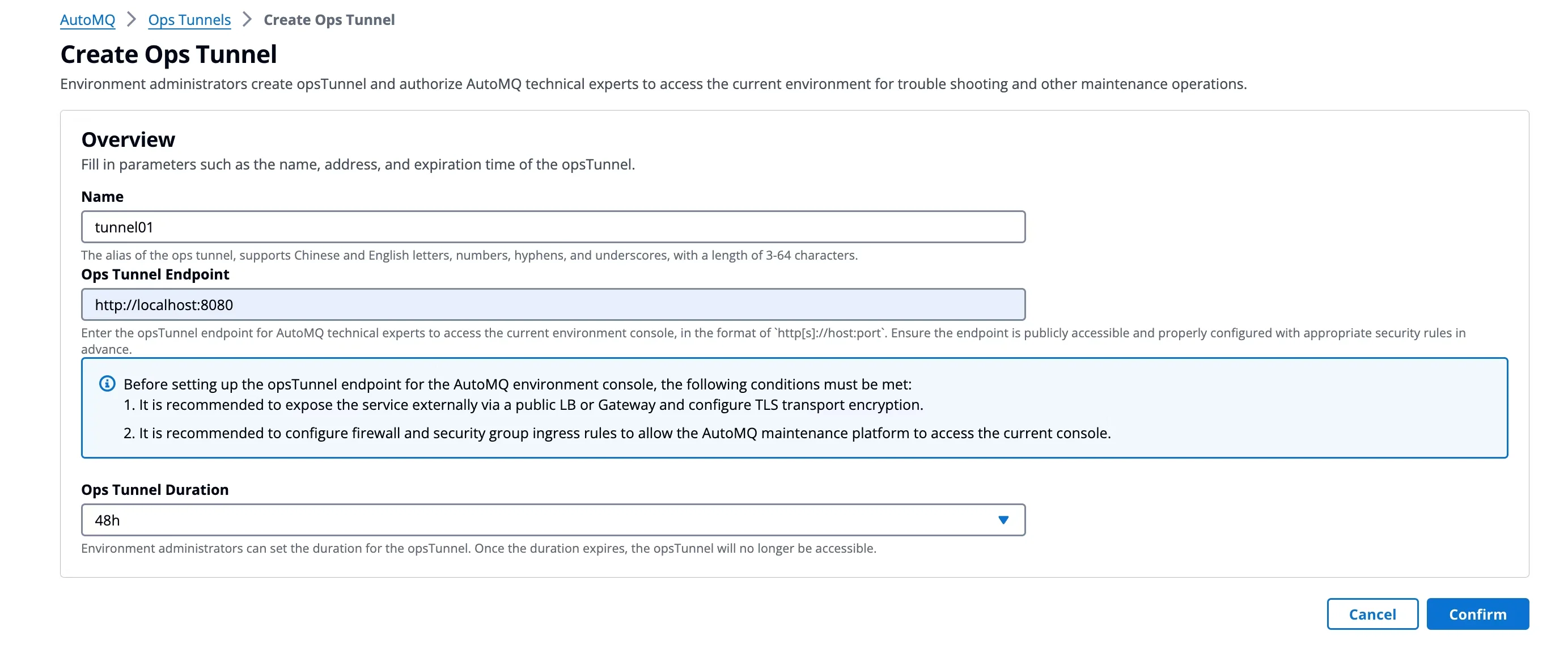 AutoMQ BYOC environments support Ops Tunnel, enabling users to establish secure, trusted, and auditable operational channels. This function allows AutoMQ technicians temporary access to the BYOC environment for the purpose of troubleshooting and analyzing complex issues.