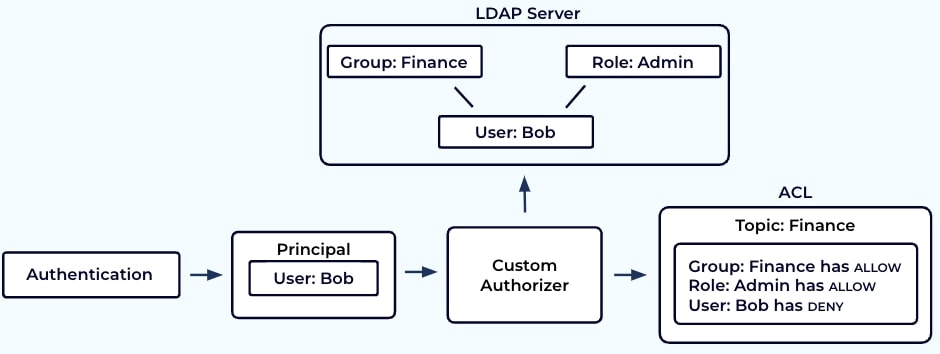 Kafka authorization determines what an authenticated entity can do once its identity has been verified. Similar to how an ATM allows you access only to your accounts after PIN verification, Kafka enables specific actions for authenticated clients based on their permissions[16]. Authorization in Kafka is implemented through Access Control Lists (ACLs), which specify which users can perform which operations on specific resources.