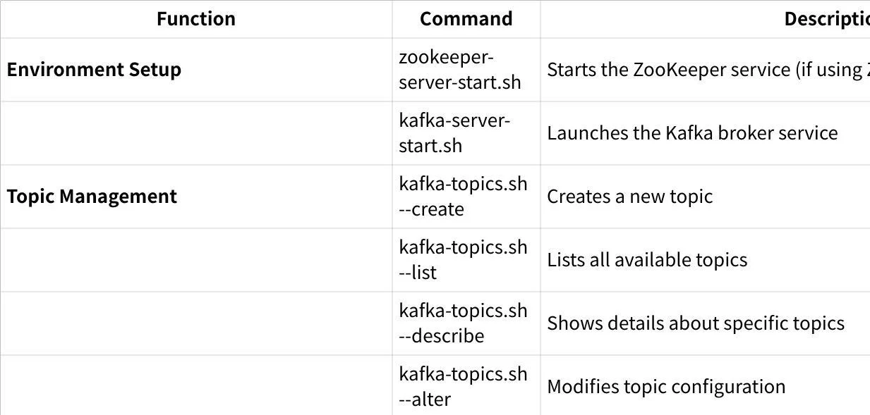The following table presents the most commonly used Kafka CLI commands organized by function: