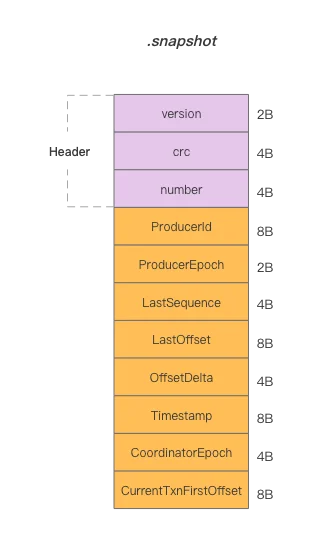 Kafka records message sequence information per partition in a .snapshot file, outlined as follows (ProducerStateManager#ProducerSnapshotEntrySchema):