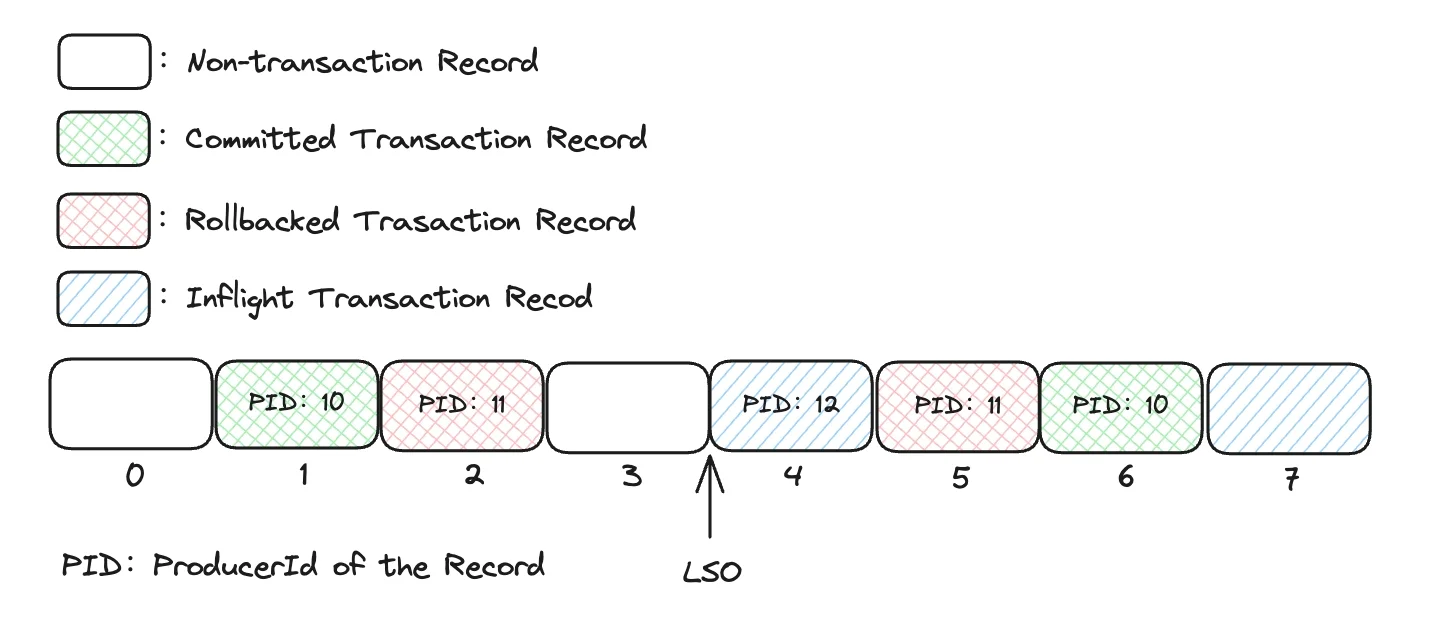 When a Broker handles an `ApiKeys.PRODUCE` request, it adjusts the LSO (Log Stable Offset) to the position of the first uncommitted transactional message. This modification enables consumers to ascertain message visibility based on the LSO: if the `isolation.level` is set to `read_committed`, only messages preceding the LSO will be accessible.
