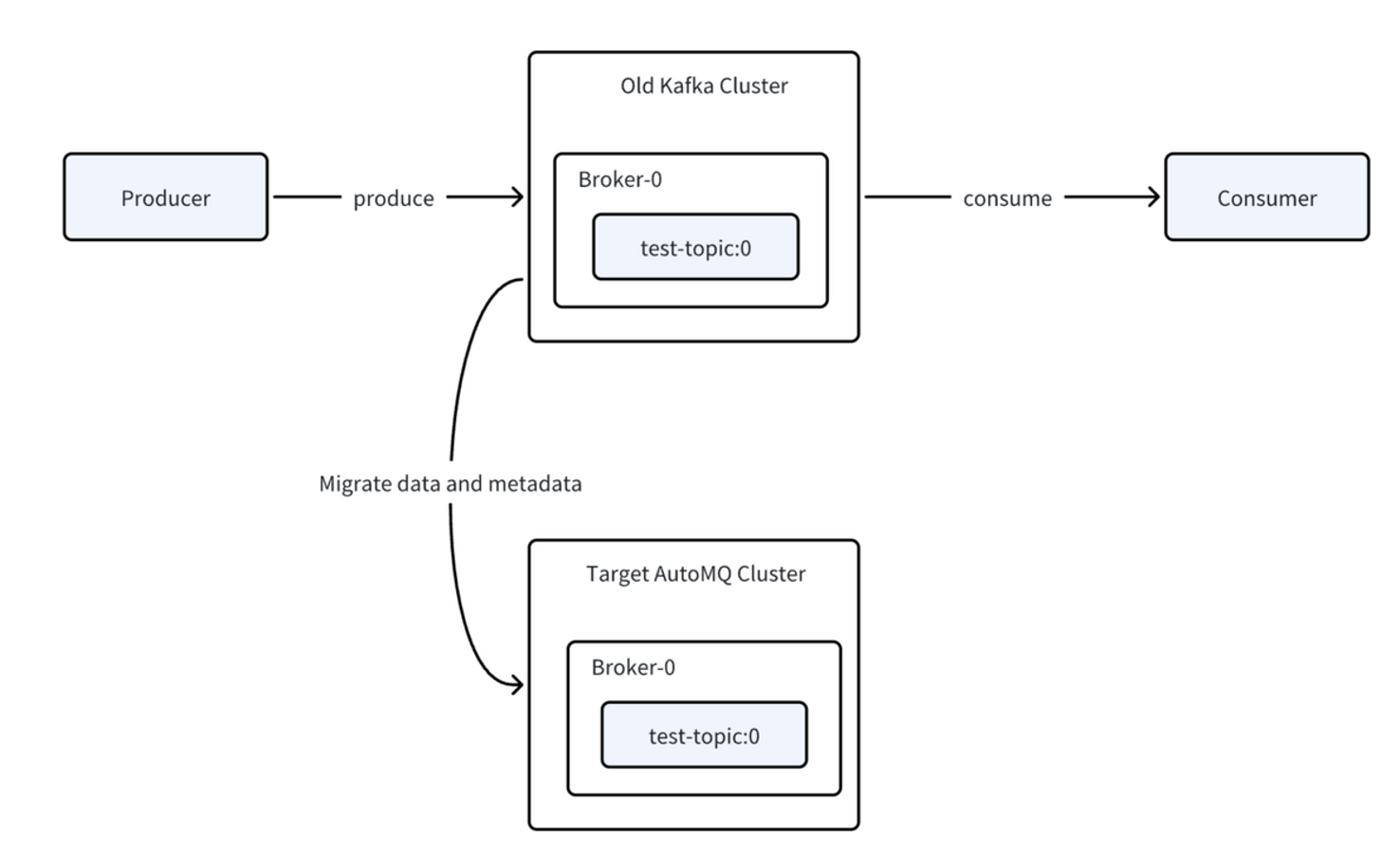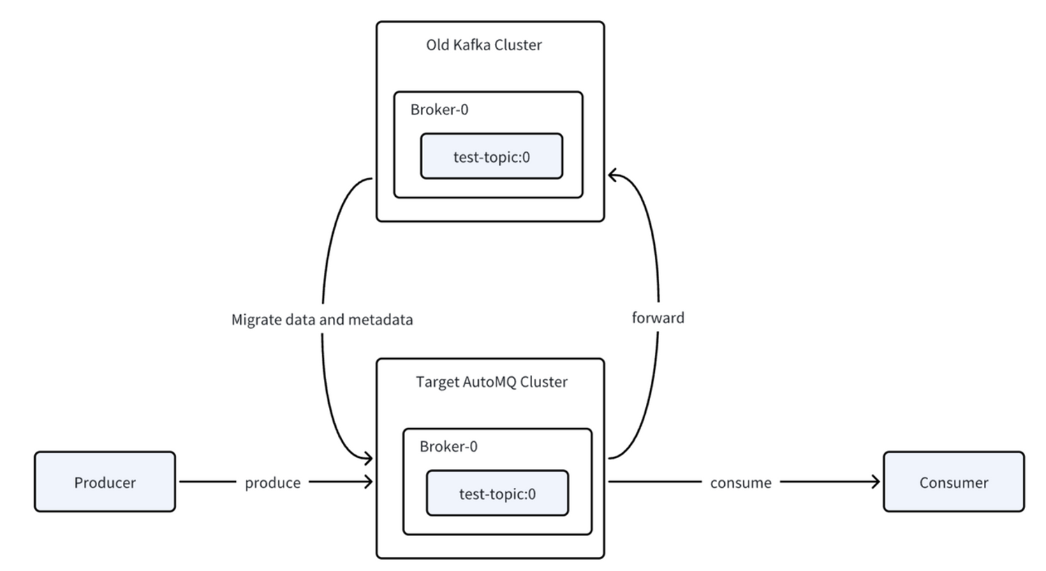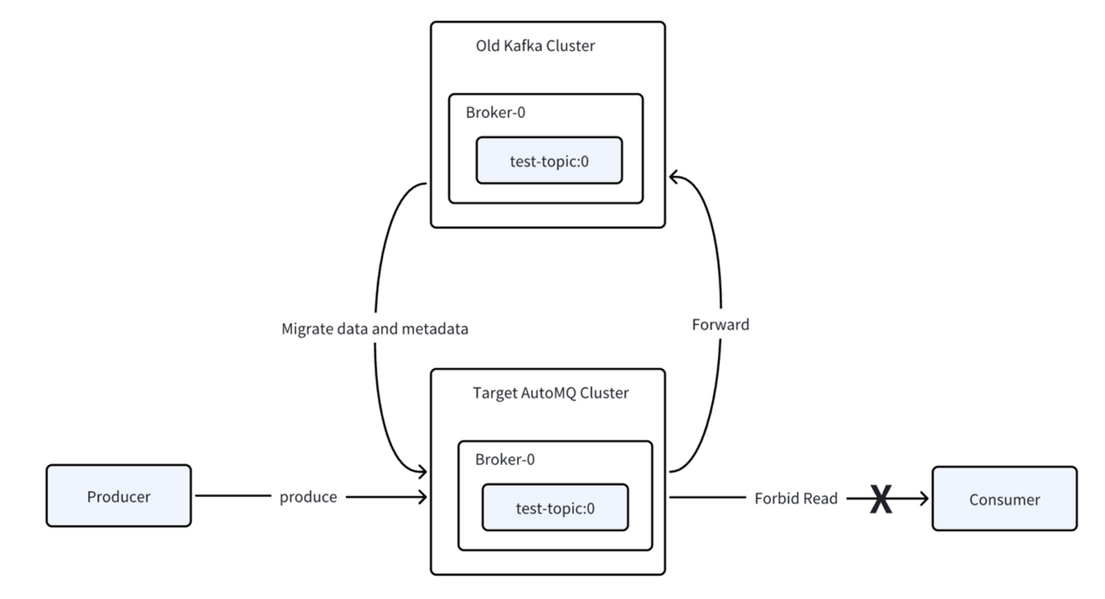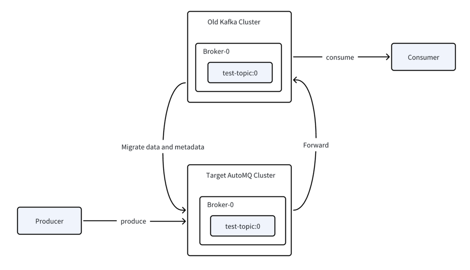 Users can choose whether to migrate producers or consumers first, though the documentation recommends starting with producers for easier rollback if issues arise. When producers are migrated to the new cluster, their data is automatically forwarded to the old cluster1. This means the AutoMQ cluster initially acts as a proxy, forwarding writes to the original cluster rather than writing directly to its own partitions, which preserves data ordering and integrity.