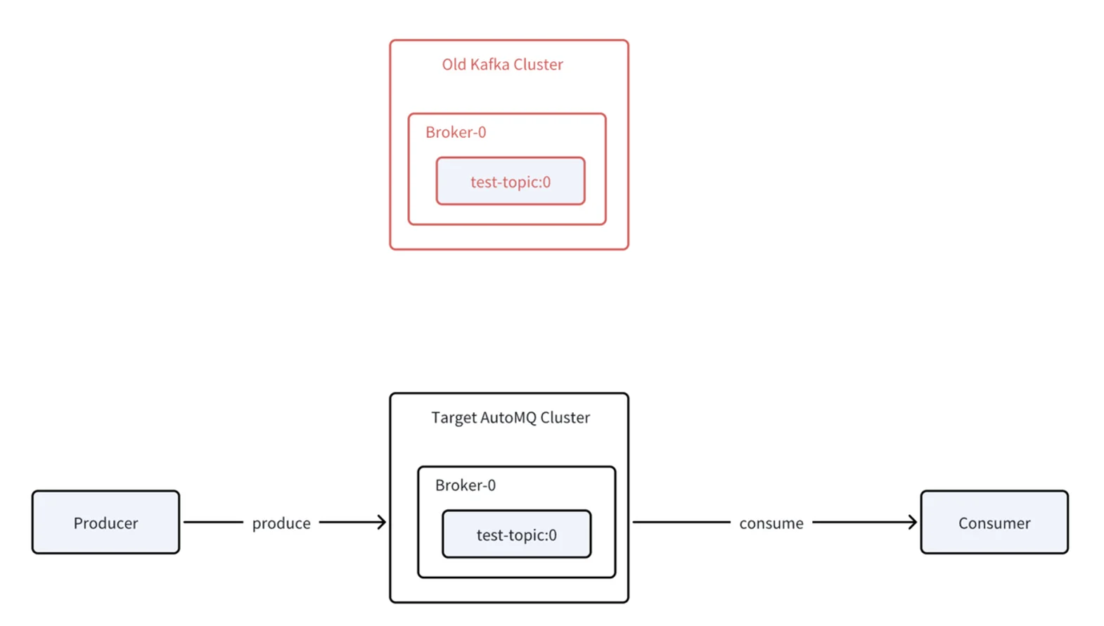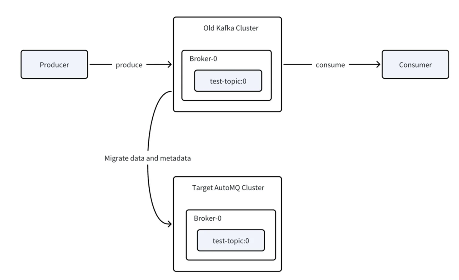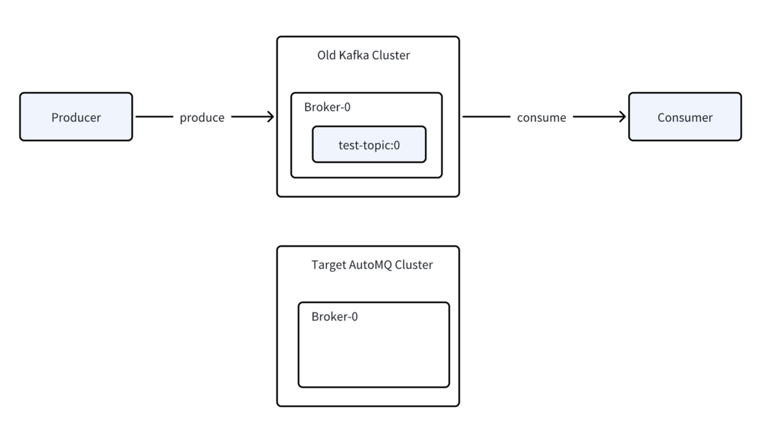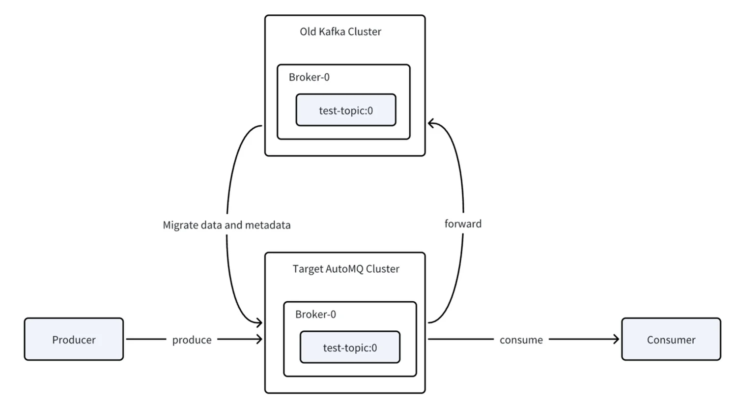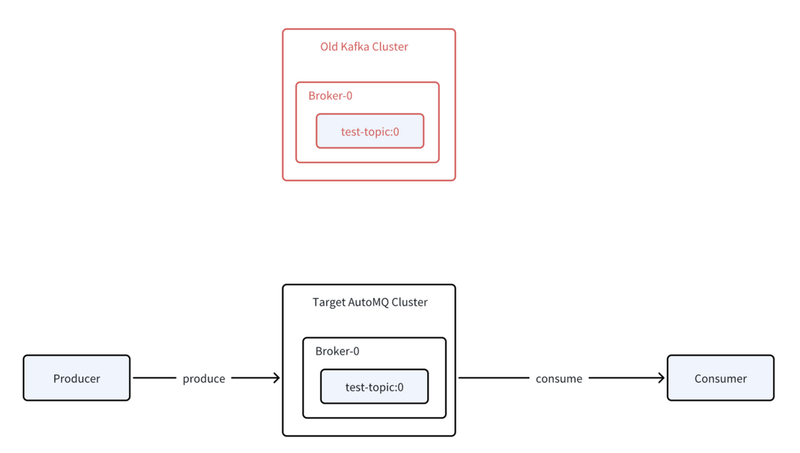 Users can choose whether to migrate producers or consumers first, though the documentation recommends starting with producers for easier rollback if issues arise. When producers are migrated to the new cluster, their data is automatically forwarded to the old cluster1. This means the AutoMQ cluster initially acts as a proxy, forwarding writes to the original cluster rather than writing directly to its own partitions, which preserves data ordering and integrity.