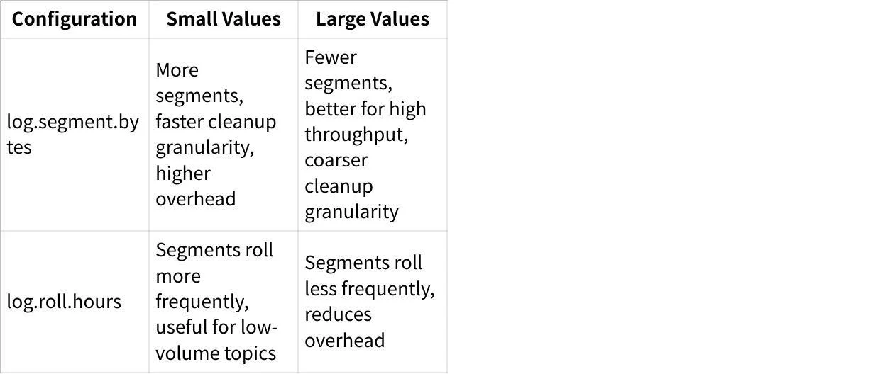 Consider segment rolling impact : Very frequent rolling creates overhead, while infrequent rolling may delay log compaction or deletion