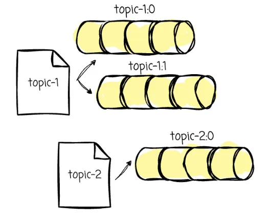 topic-1: with 2 partitions (topic-1:0,topic-1:1)topic-2: with 1 partition (topic-2:0)