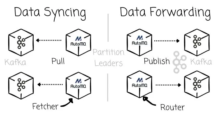 The AutoMQ’s partition leaders (in this case, the Routers) are responsible for the AutoMQ → Kafka message forwarding: