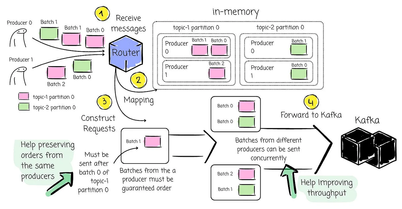 When the Router completes constructing requests, it sends them to Kafka and starts creating new requests right away. Batches from different producers could be sent concurrently to improve throughput, while batches from the same producer must be sent sequentially to preserve order.