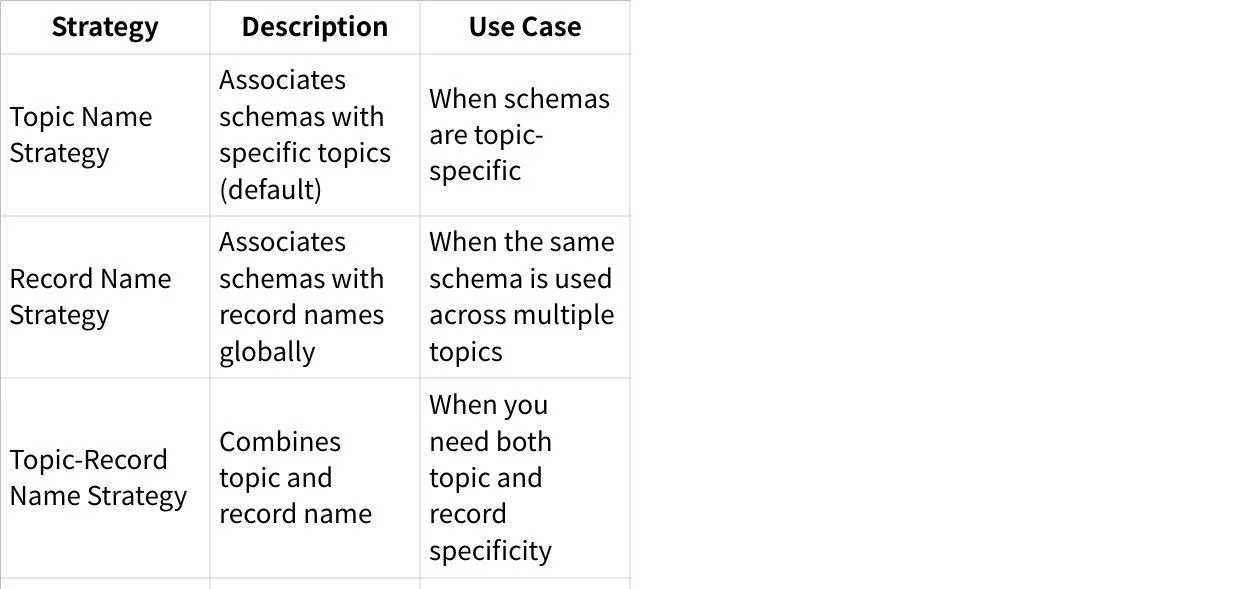 Subjects provide a unique namespace for organizing schemas. The subject naming strategy determines how schemas are associated with topics: