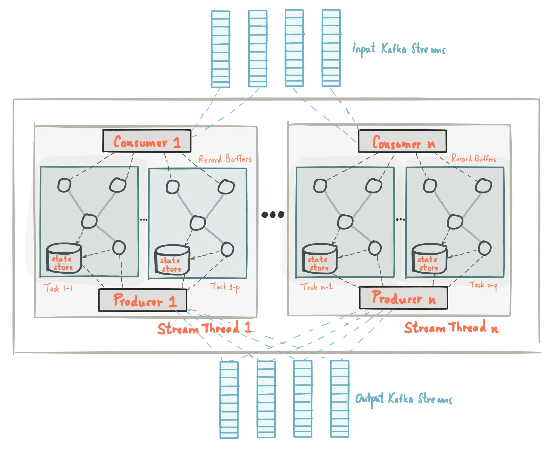A Kafka Streams application contains multiple stream threads, each containing multiple stream tasks. The processor topology defines how these components interact to process data.
