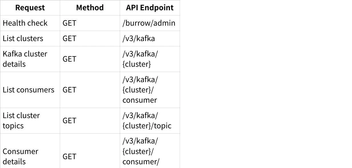 Burrow exposes several REST API endpoints that provide information about Kafka clusters, consumer groups, and their status. Some key endpoints include:
