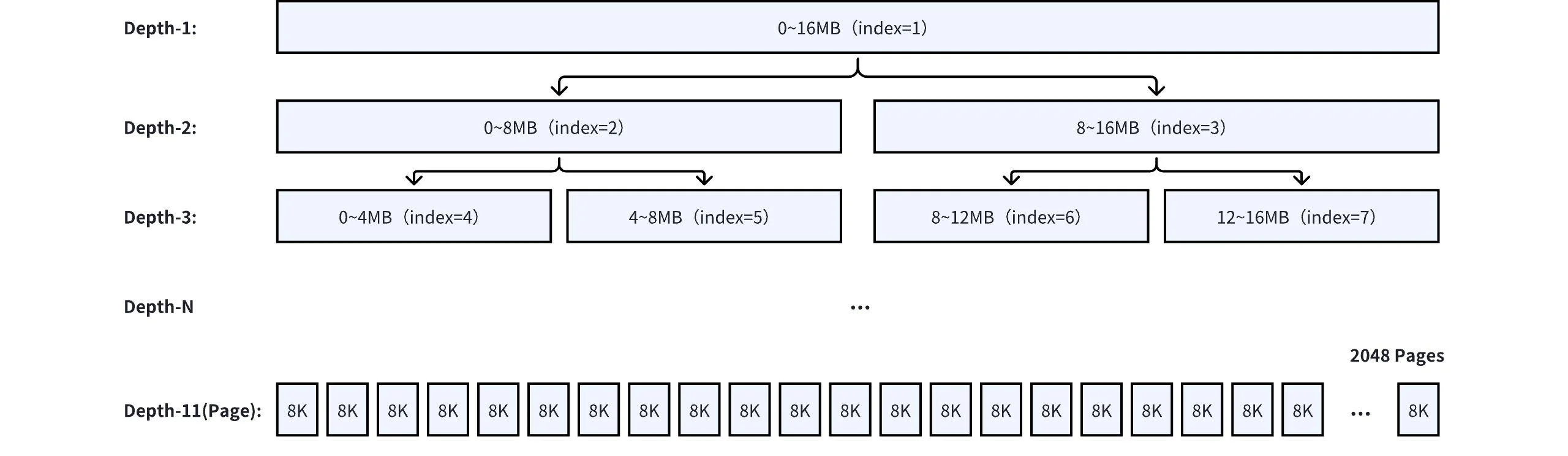 Netty versions prior to 4.1.52 use the Buddy Allocation Algorithm, which originates from jemalloc3. To improve memory allocation efficiency, Netty requests a contiguous chunk of memory (PoolChunk) from the operating system at once. When a ByteBuf is requested from the upper layer, this chunk of memory is logically divided and returned as needed. The default size of a PoolChunk is 16MB, which is logically divided into 2048 pages, each 8KB in size. The memory usage is represented by a complete binary tree.