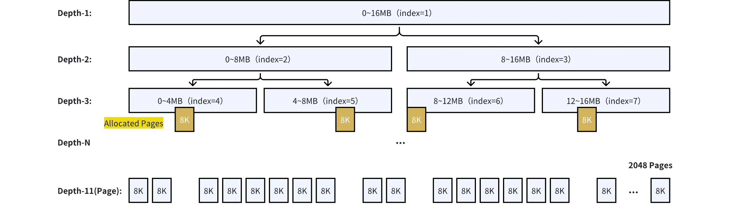 Next, let's examine the allocation of medium-sized memory blocks, Normal [8KB, 16MB]. Suppose we request 2MB + 1KB = 2049KB from a completely idle PoolChunk: