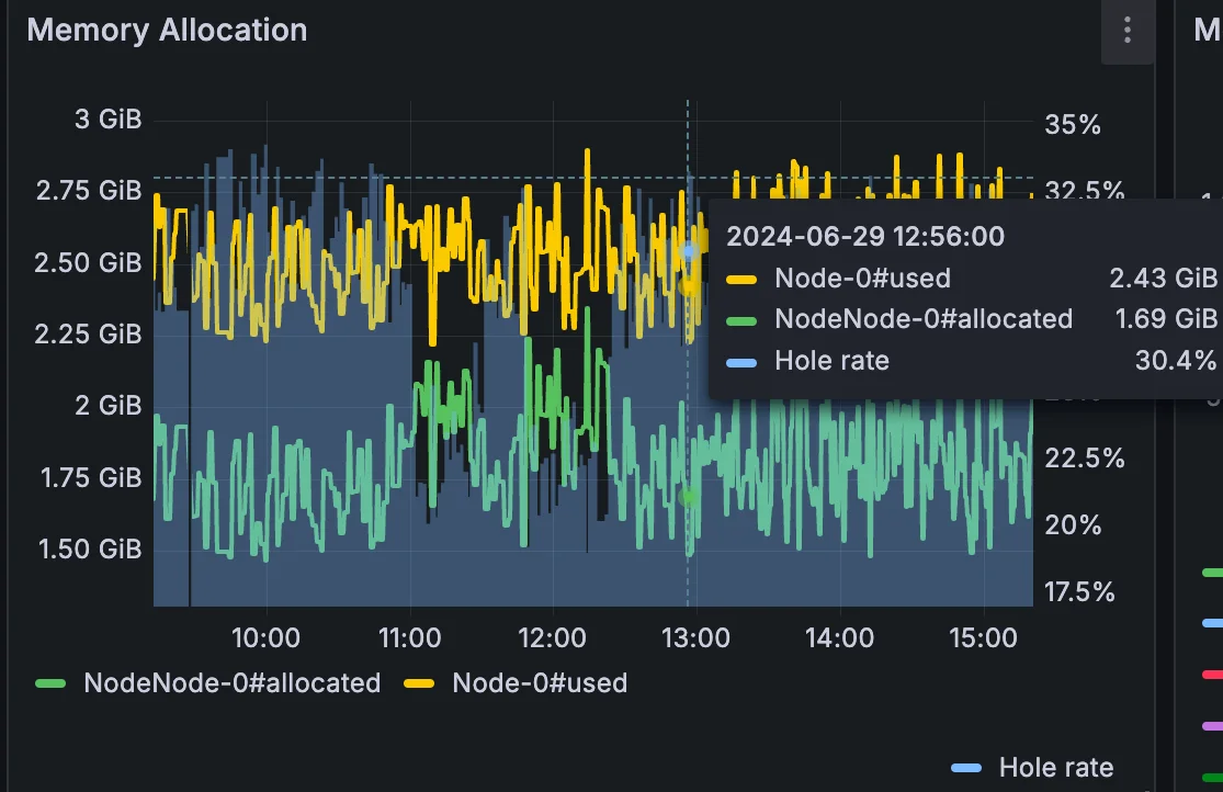 After adding categorized memory statistics, it was found that the memory usage of various types was within the expected range. However, it was observed that there was a significant discrepancy between the memory requested by AutoMQ and the actual memory allocated by Netty. This discrepancy grew over time, sometimes even resulting in Netty's actual memory usage being twice that of AutoMQ's requested memory. This discrepancy was identified as memory fragmentation in memory allocation.