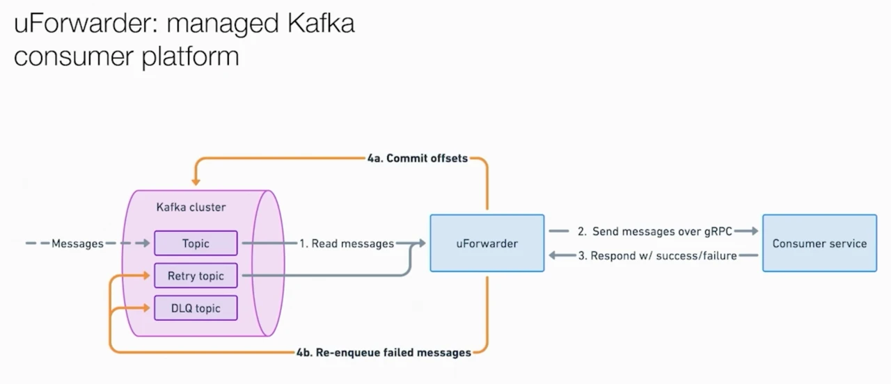 | Partition processing | UForwarder distributes messages randomly to consumer instances, no sharding | Use Apache Flink for stateful stream processing |