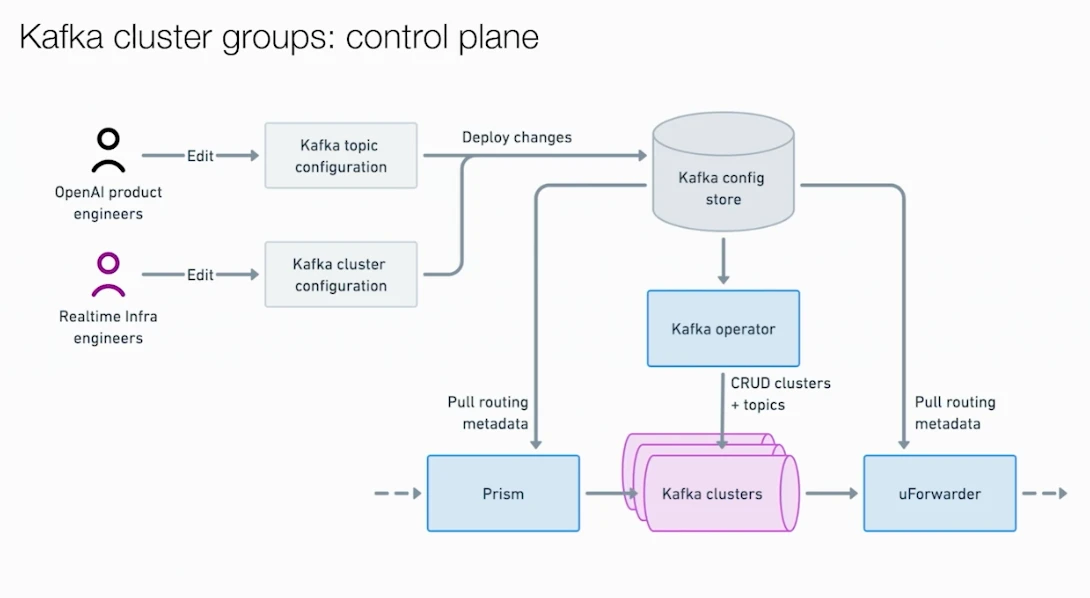 OpenAI had over 30 independent Kafka clusters at the time, most spun up ad hoc by different product teams at different points. Configurations were inconsistent across clusters, and some were even running on different Kafka-compatible engines. The first question a new engineer faced wasn't "how do I use Kafka" but "which cluster is my topic on." Onboarding a product team onto Kafka took days or even weeks — something that should have taken hours.
