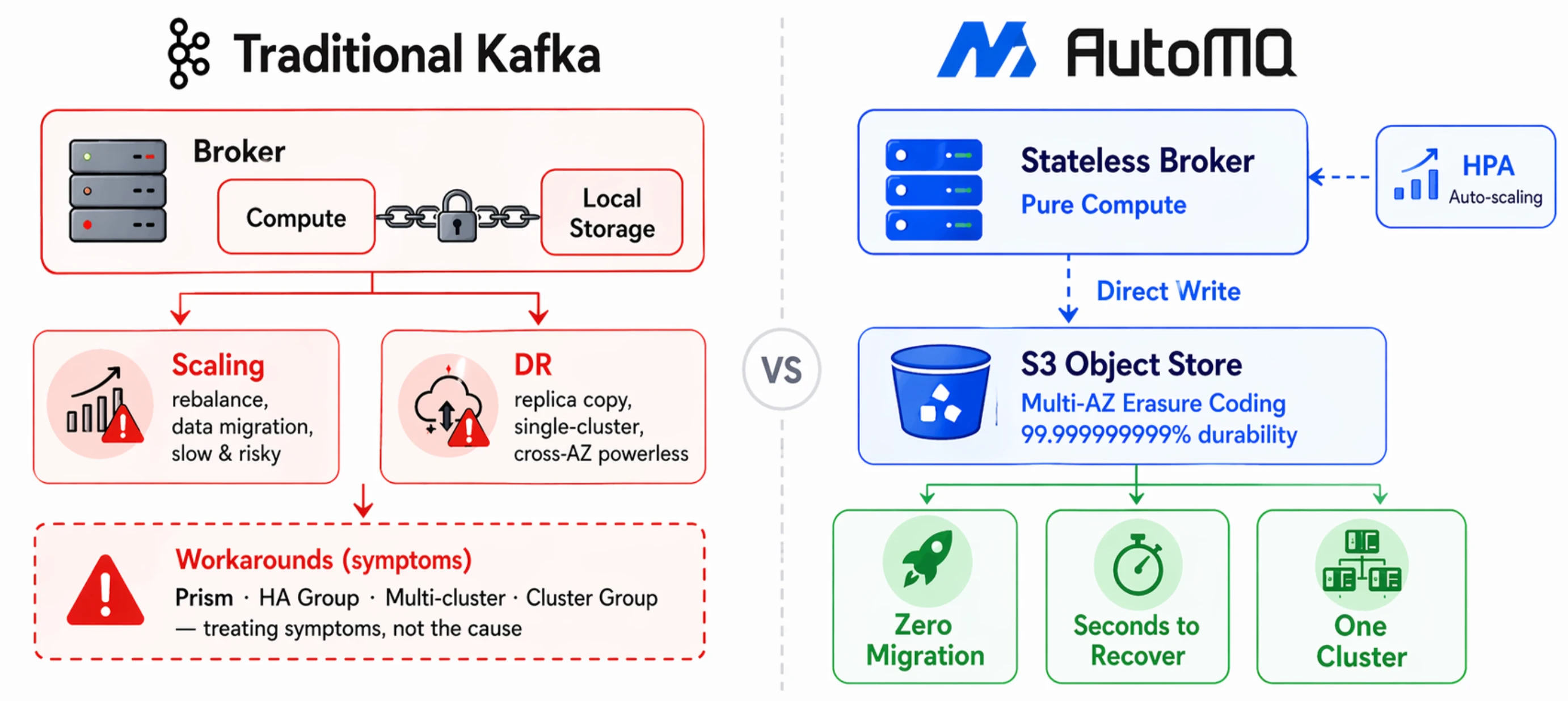 | No single-cluster disaster recovery | Multi-cluster HA Group + circuit breakers | S3-native multi-AZ durability, broker failure recovery in seconds |