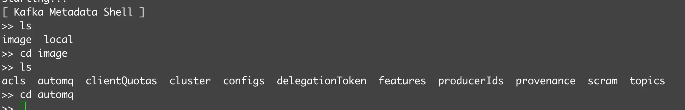 ./kafka-metadata-shell.sh -s /tmp/kraft-combined-logs/__cluster_metadata-0/000000000000000xxxxxx-00000000xxx.checkpointWe can access the entire cluster's metadata information just like using the Zookeeper command line