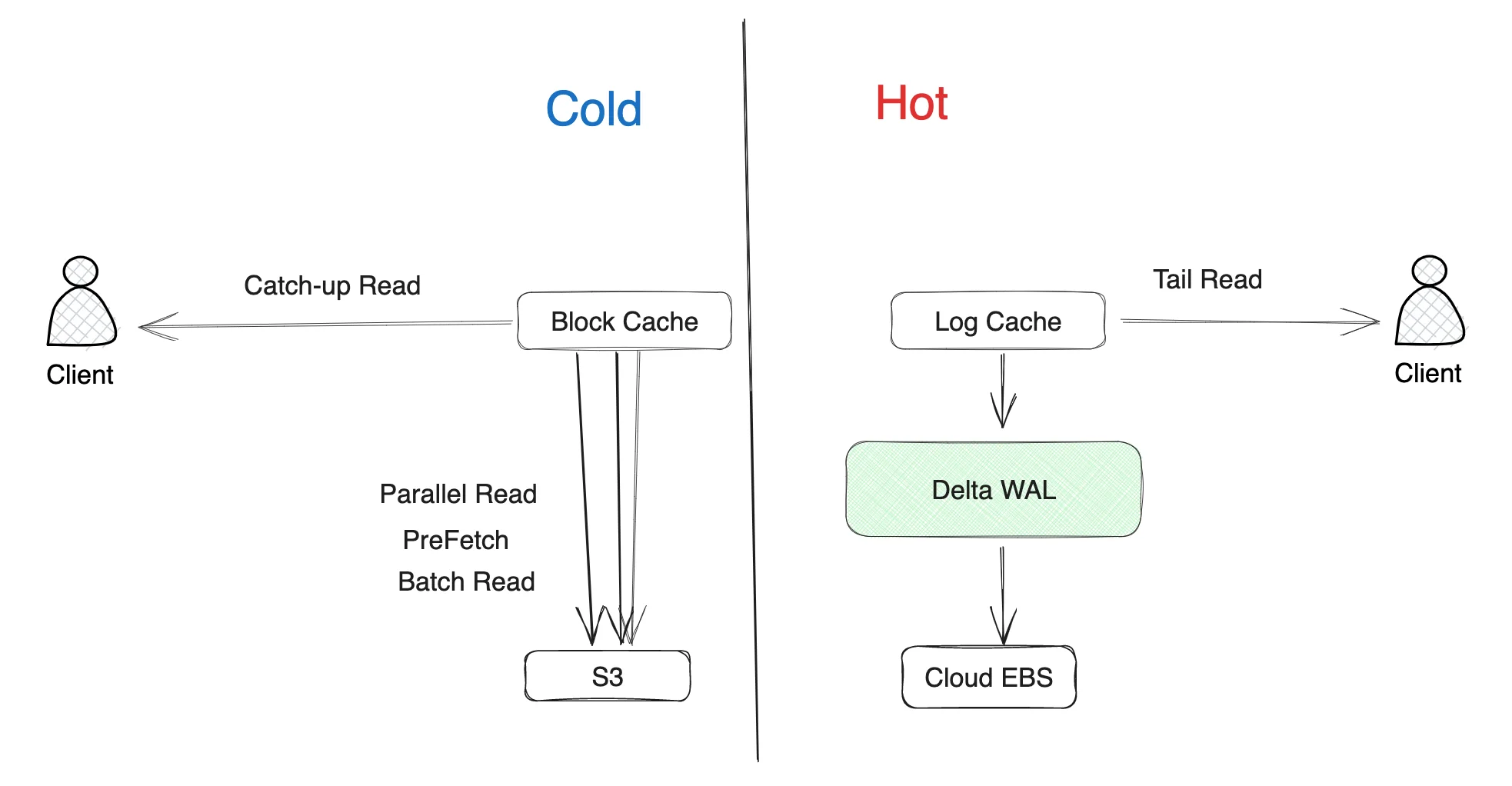 S3Stream has designed a cold-hot isolated cache system that consists of Log Cache (which caches newly written data) and Block Cache (which caches data pulled from object storage). The data in Log Cache will not become invalid in memory before the data in WAL has been uploaded to object storage. If data cannot be retrieved from Log Cache, it will be read from Block Cache instead. Block Cache ensures that even cold reads can hit the memory as much as possible through methods such as prefetching and batch reading, thereby ensuring the performance of cold read operations.