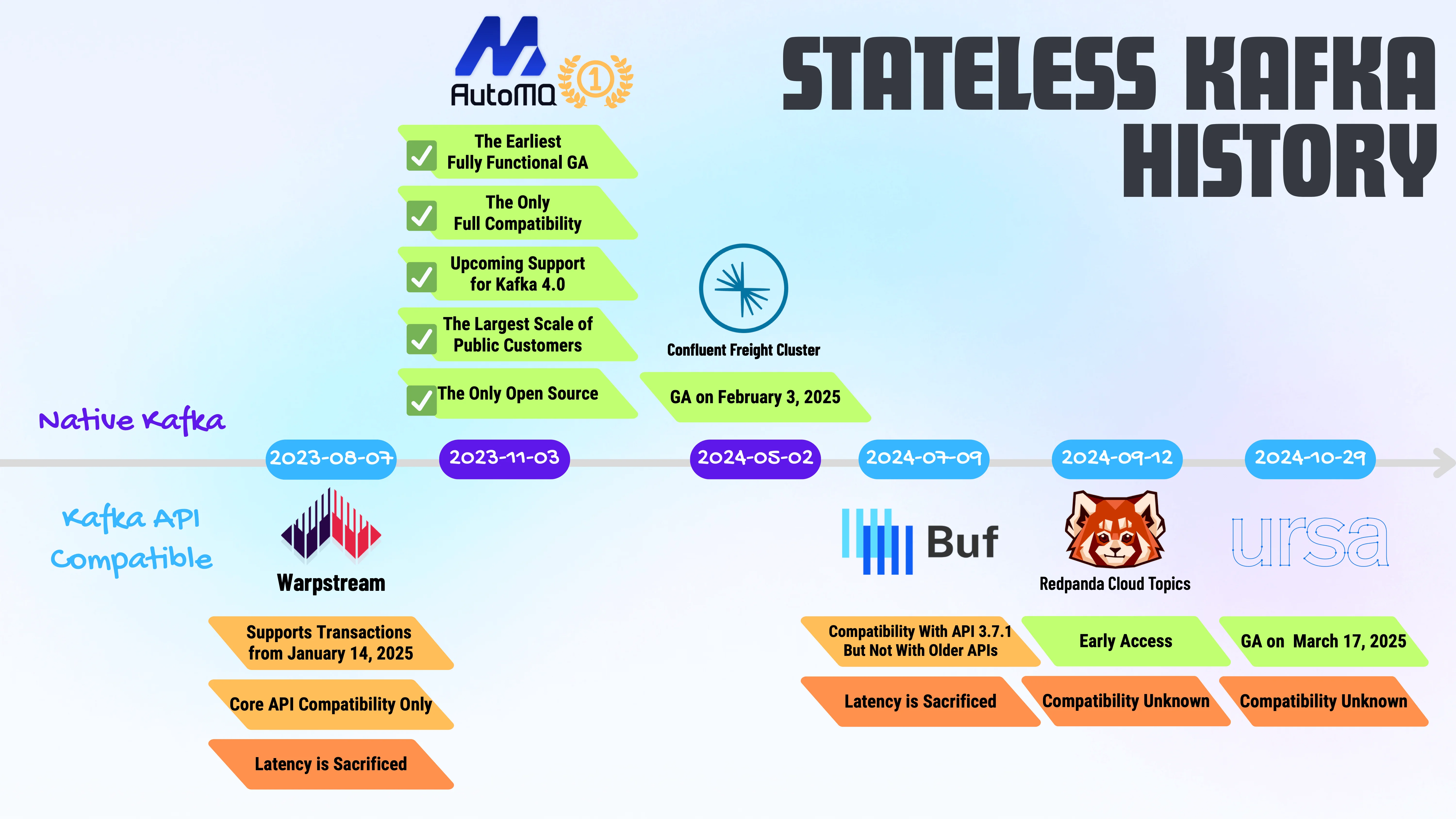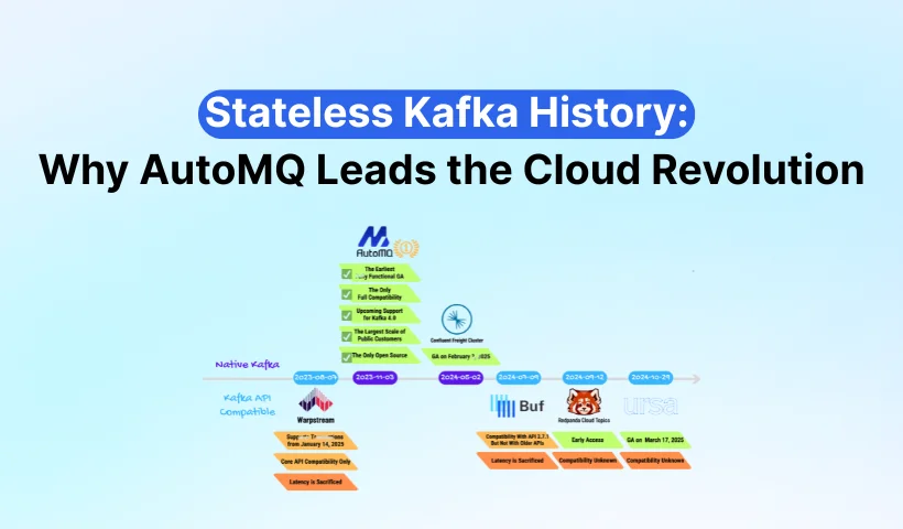 Among the leading stateless Kafka solutions, AutoMQ stands out as the industry's pioneer. AutoMQ is the earliest fully functional GA stateless Kafka solution, and it’s the only open-source option that is fully compatible with native Kafka.