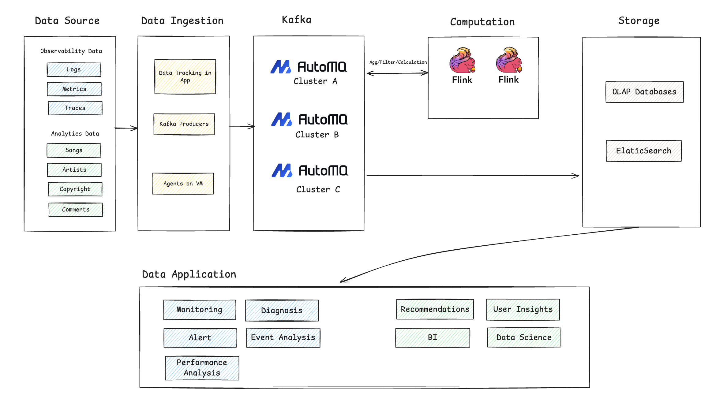 Data Source: Data sources are divided into two main categories. The first is observability data , including massive volumes of service logs, key metrics, and trace information. The second is analytics data , covering business metadata like songs, artists, and copyrights, as well as user behavior data such as plays and comments.