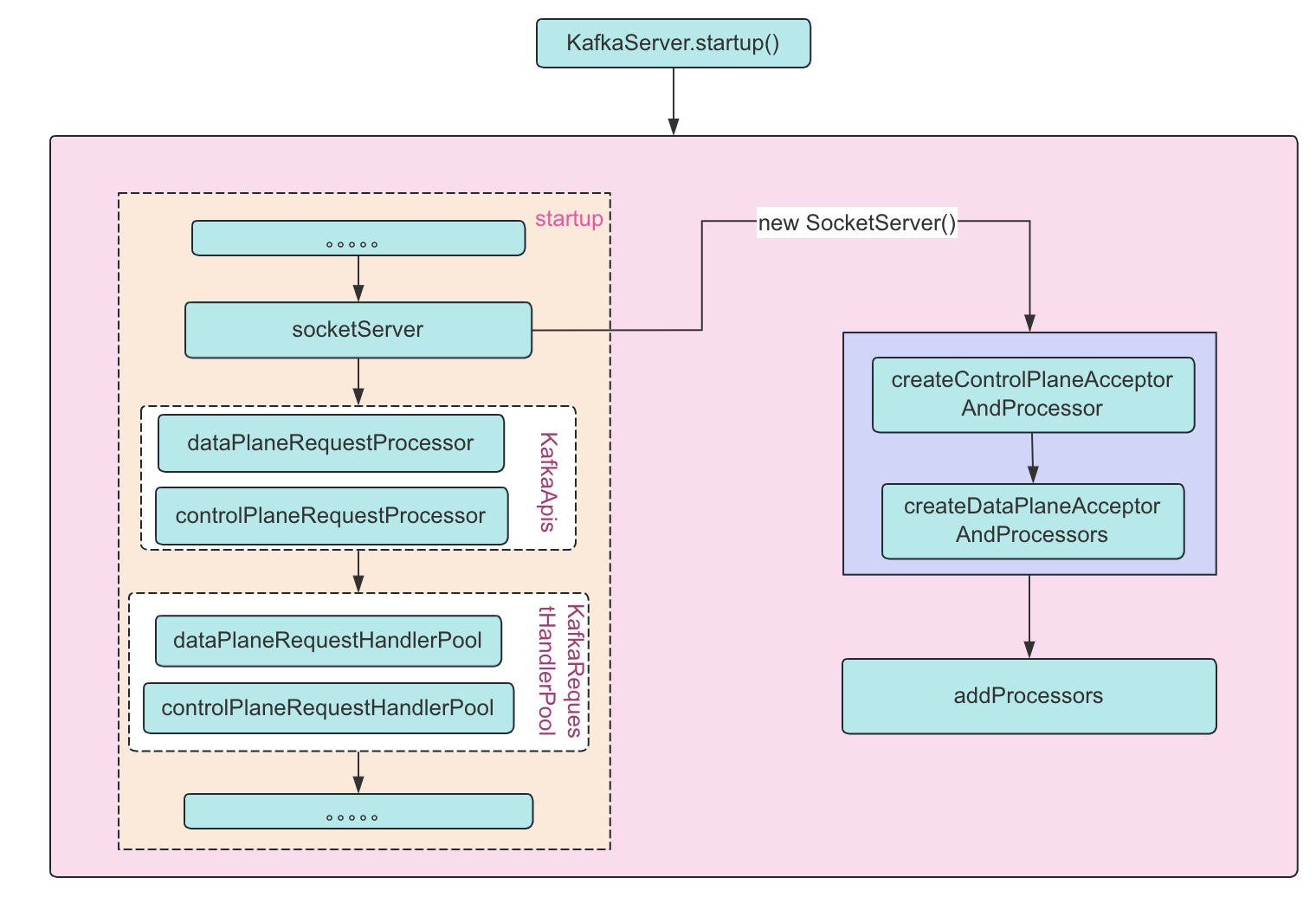 KafkaServer initializes SocketServer, dataPlaneRequestProcessor (KafkaApis), and dataPlaneRequestHandlerPool