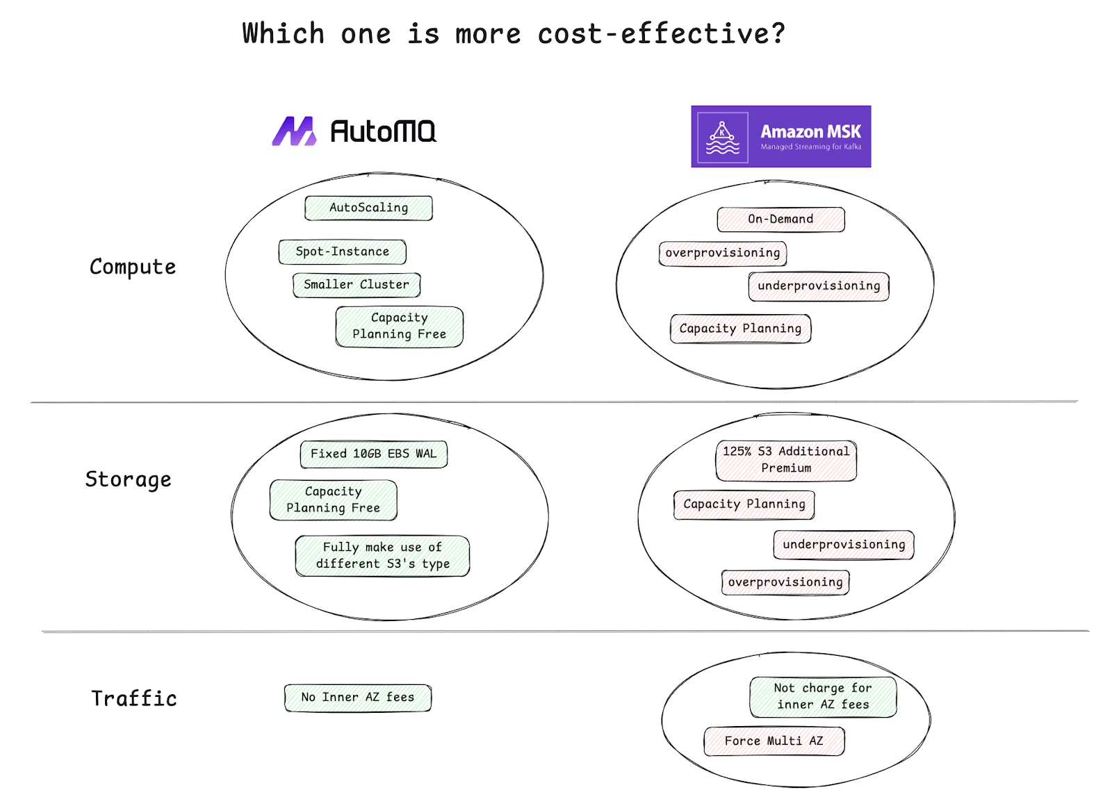 | Broker Cost | Always-on EC2 instances are billed hourly | Stateless brokers scale up or down in seconds |