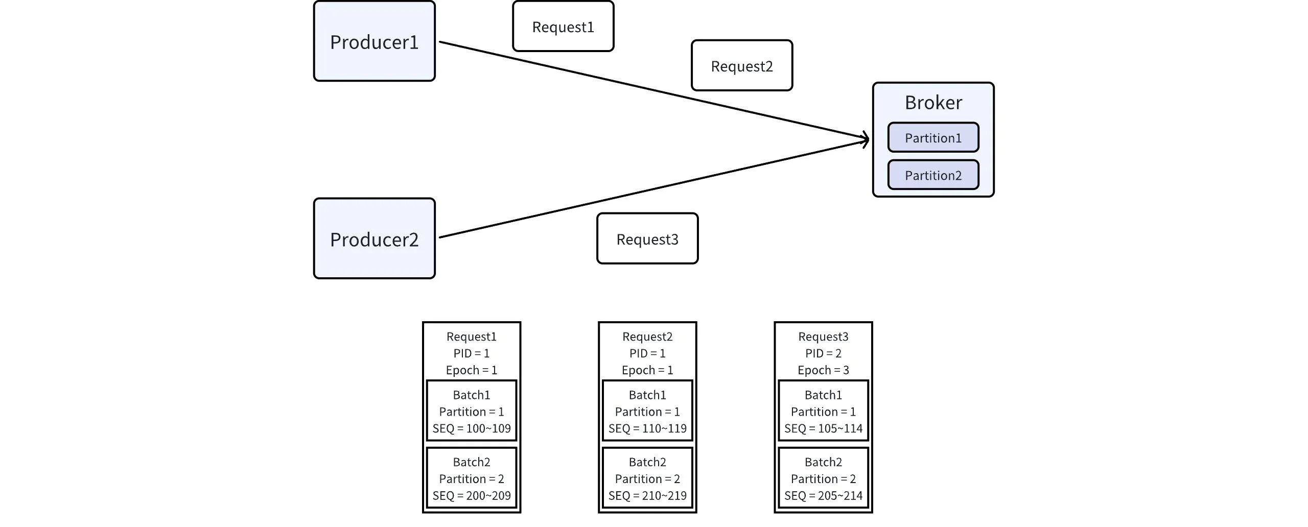 In fact, besides the aforementioned two attributes, there's also the Producer Epoch, which, in conjunction with the PID, uniquely identifies a Producer. The Producer Epoch has different usages in different scenarios: