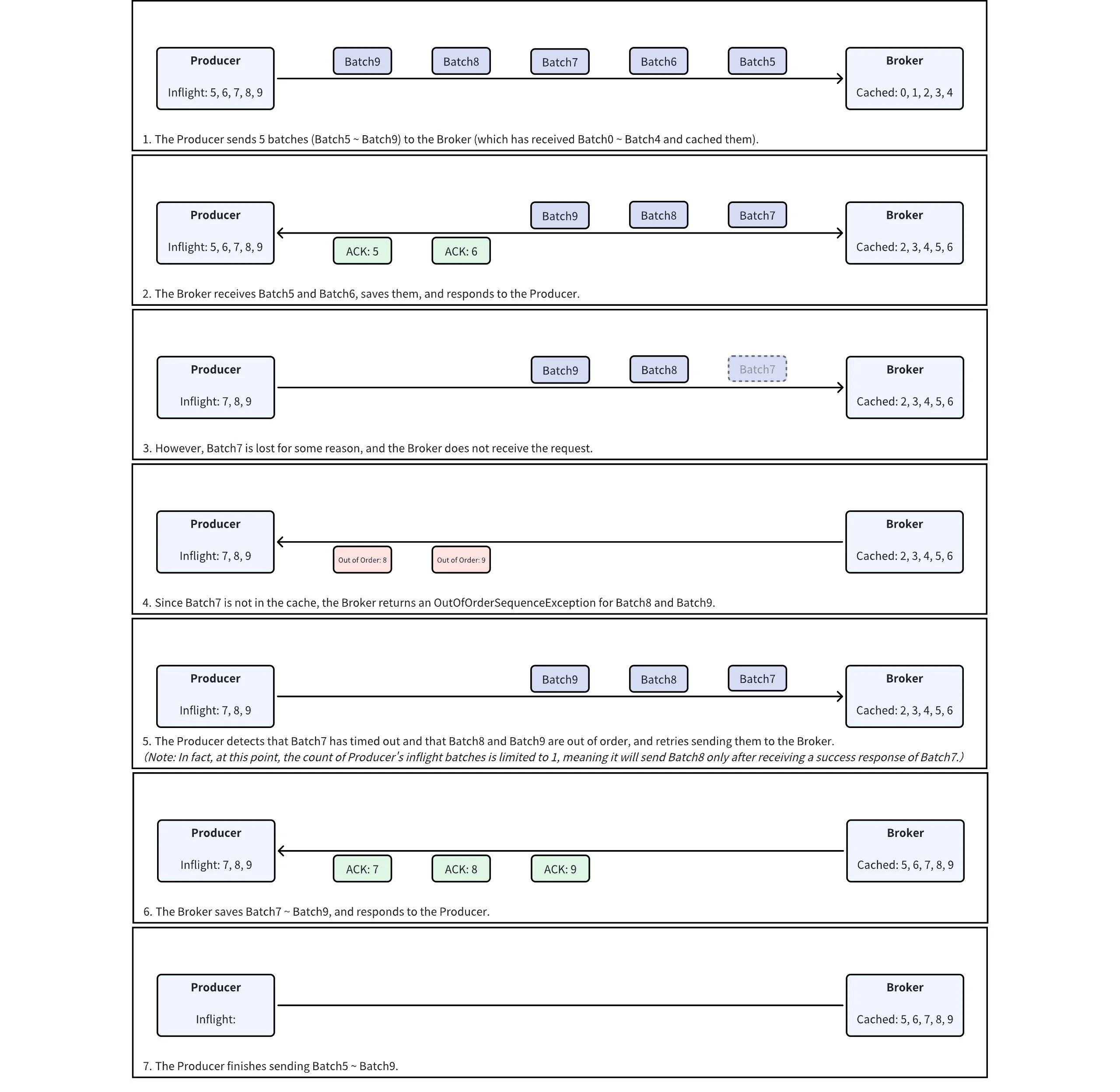 As mentioned earlier, the Producer's configuration `max.in.flight.requests.per.connection` has an upper limit of 5, which is also the number of latest Batches cached by the Broker for each PID in each Partition. This approach is taken because when the number of Inflight Requests (e.g., 2) exceeds the number of Batches cached by the Broker (e.g., 1), the following counterexample exists: