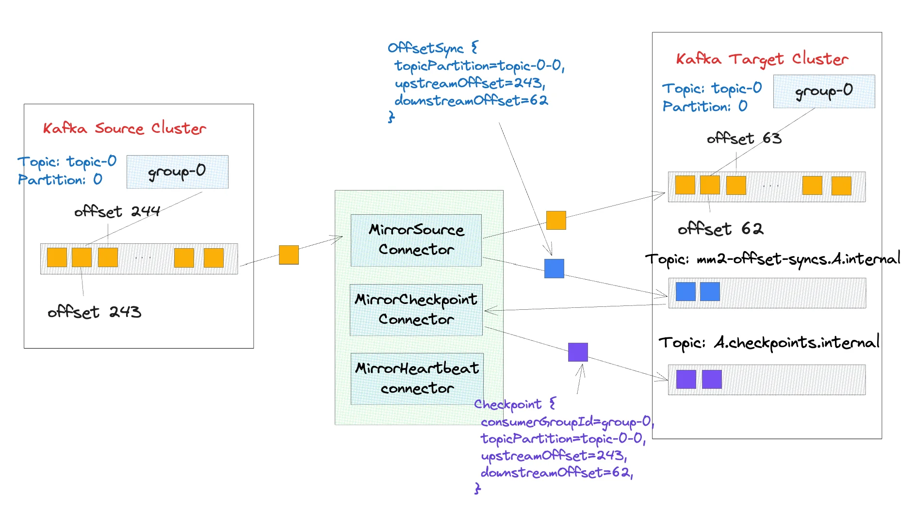 connect-offsets: Stores the consumer offsets for MirrorSourceConnector and MirrorCheckpointConnector in MM2.