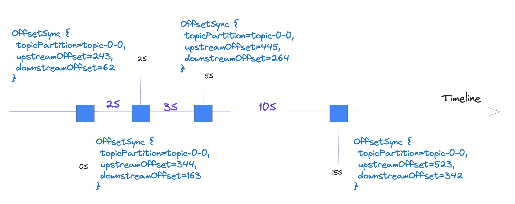 Recording the offset mapping information in the OffsetSync messages is essential, as a message synchronized from the source to the target cluster is likely to have different offsets before and after synchronization, and there might be scenarios of message duplication and topics from multiple source clusters being synchronized to a single target topic. Offset mapping greatly assists in aligning messages from the source cluster with those in the target cluster.