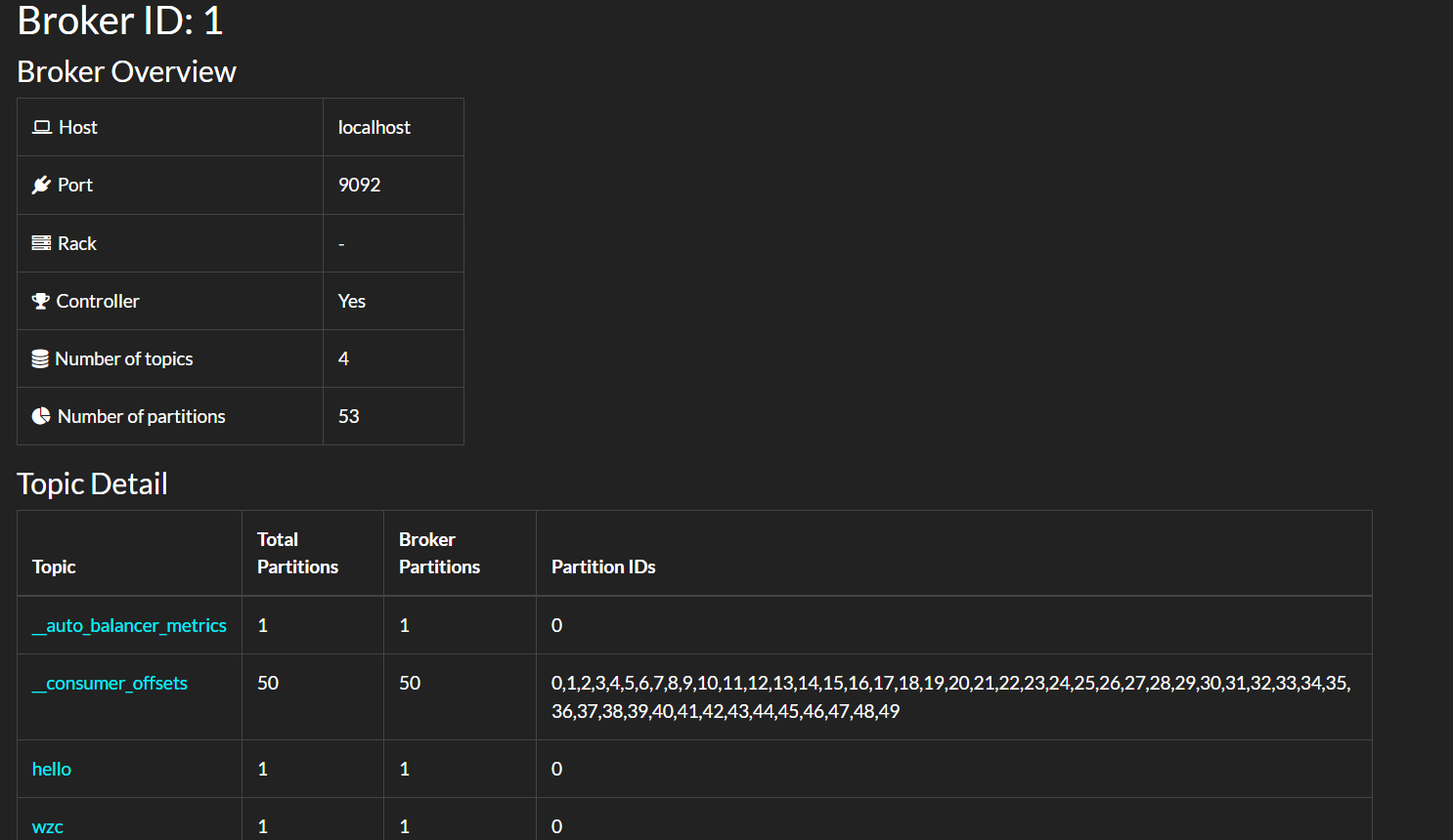 Kafdrop-ui [1] is a simple, intuitive, and powerful web UI tool designed for Kafka. It allows developers and administrators to easily view and manage key metadata of Kafka clusters, including Topics, partitions, Consumer Groups, and their offsets. By providing a user-friendly interface, Kafdrop greatly simplifies the monitoring and management of Kafka clusters, enabling users to quickly obtain cluster status information without relying on complex command-line tools.