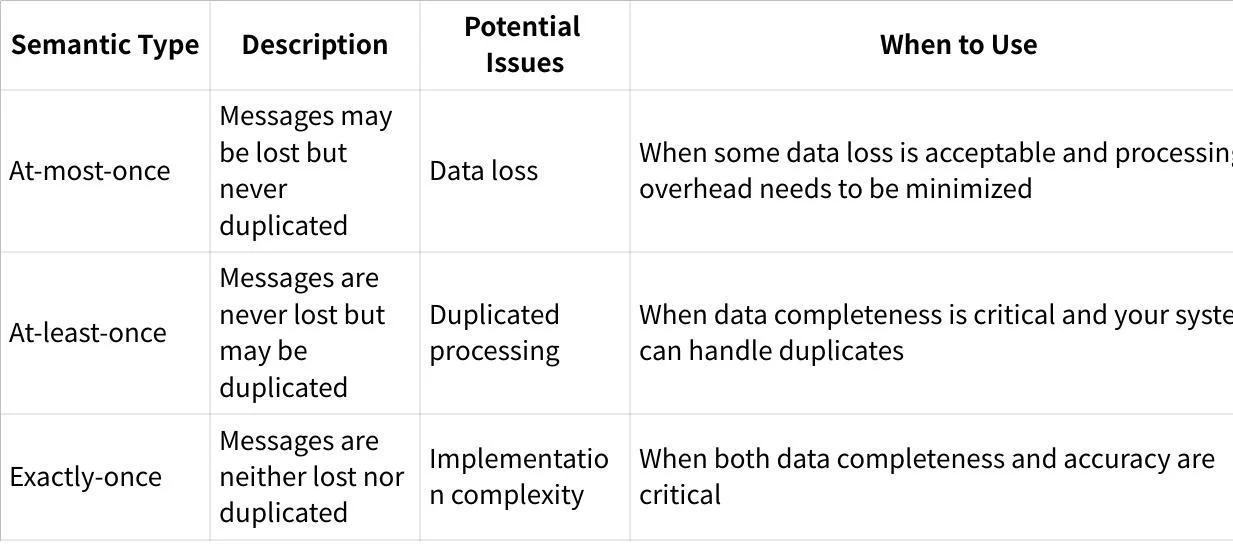 Before diving into Kafka's specific implementation, it's important to understand the spectrum of delivery guarantees in messaging systems: