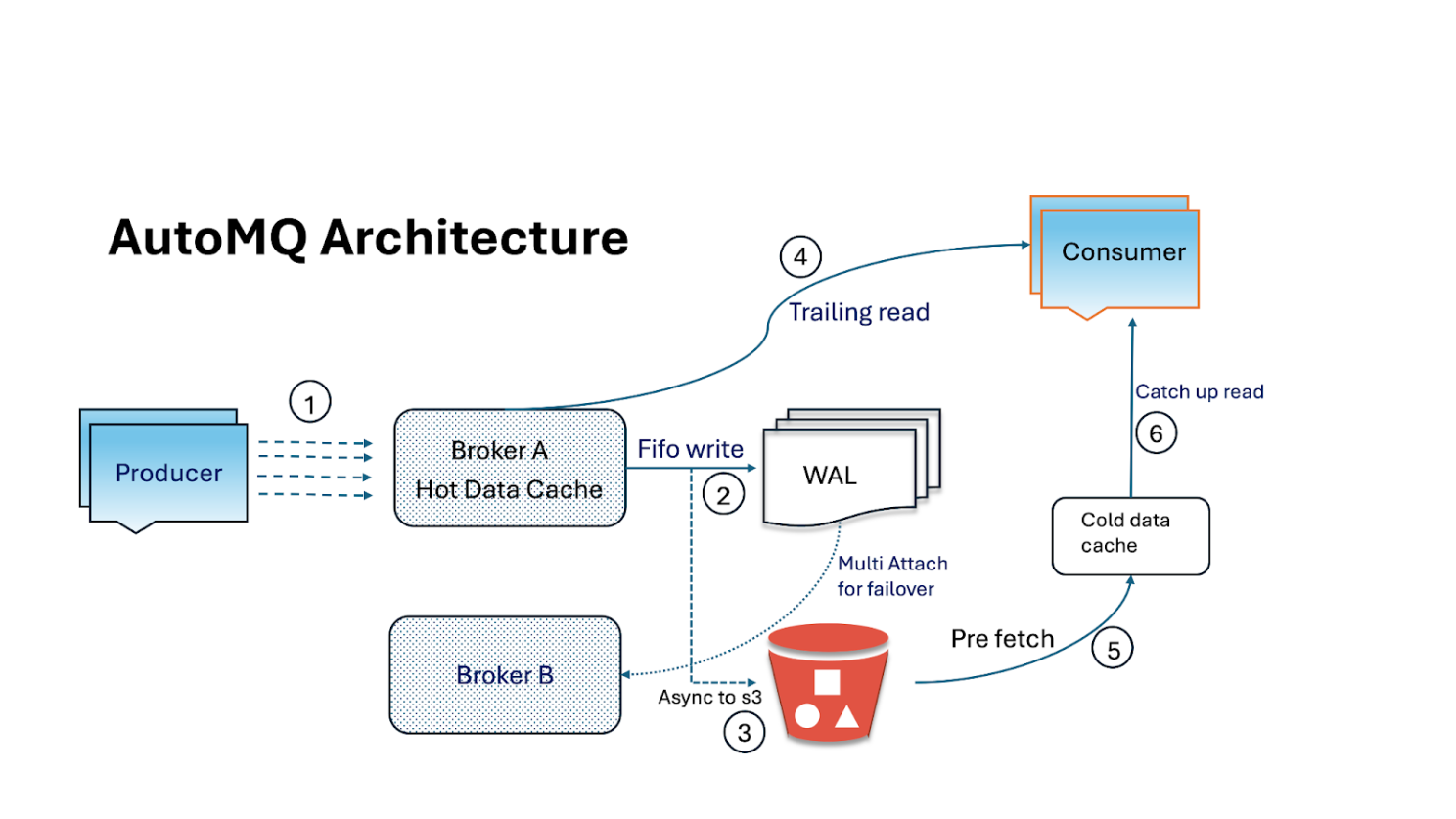Here’s where AutoMQ made a smart move: they added a Write-Ahead Log (WAL) abstraction. Messages are first appended to a small, durable WAL (backed by block storage like EBS/NVMe), while long-term durability is handled by S3. This reduces latency while still keeping brokers diskless.