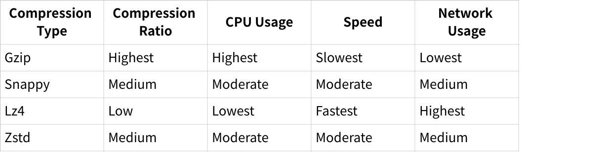 Enabling compression (particularly lz4 or zstd) can significantly increase effective throughput by reducing the amount of data that needs to be transferred over the network[1]. The choice of compression algorithm should balance compression ratio with CPU overhead.