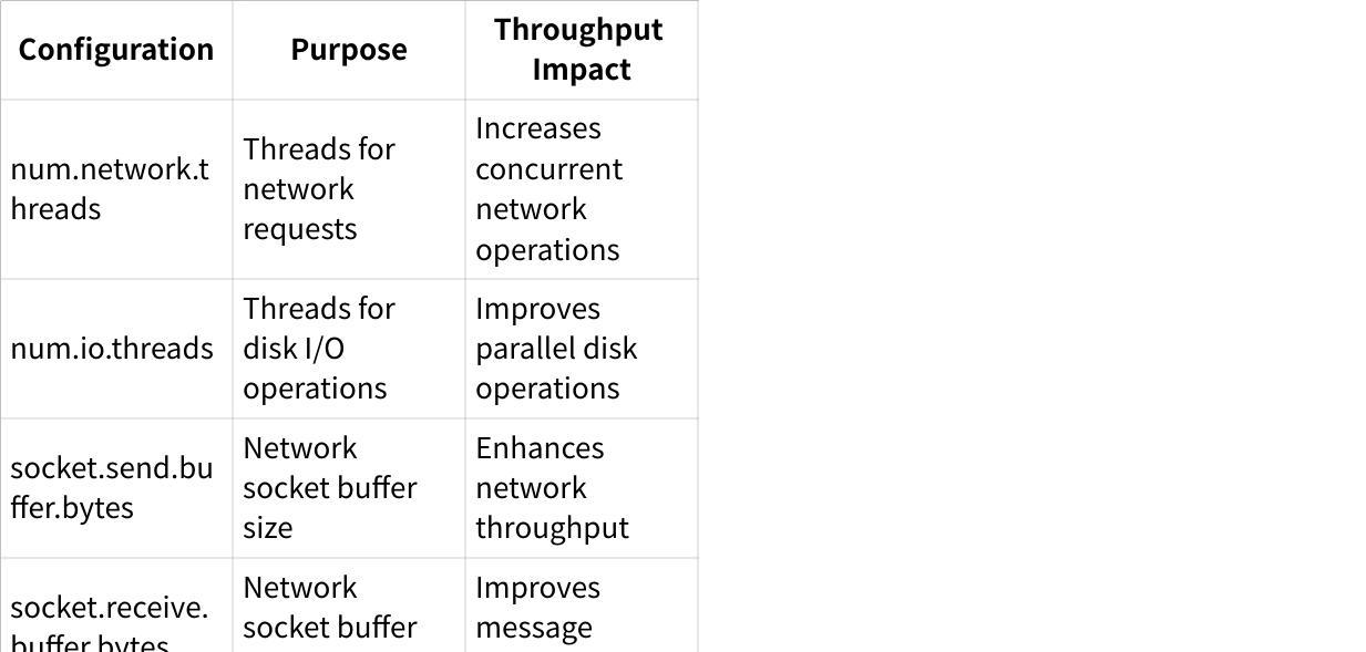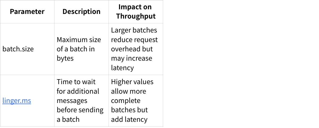 Proper configuration of Kafka producers plays a crucial role in achieving high throughput. The following parameters are particularly important: