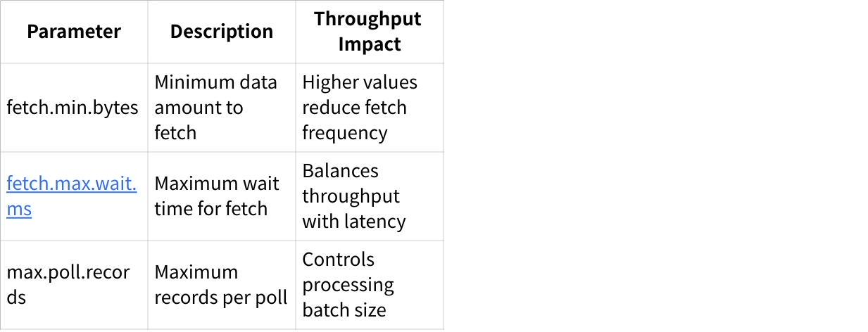 Network latency directly affects how many batches can be processed per second. For example, with a round-trip latency of 10ms, throughput is limited to approximately 100 batches per second per thread just from network constraints alone[8]. Reducing network latency through proper infrastructure and configuration is therefore critical for high-throughput applications.