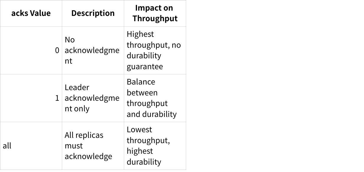 Setting acks=1 provides a good balance between throughput and data durability for most use cases[1].