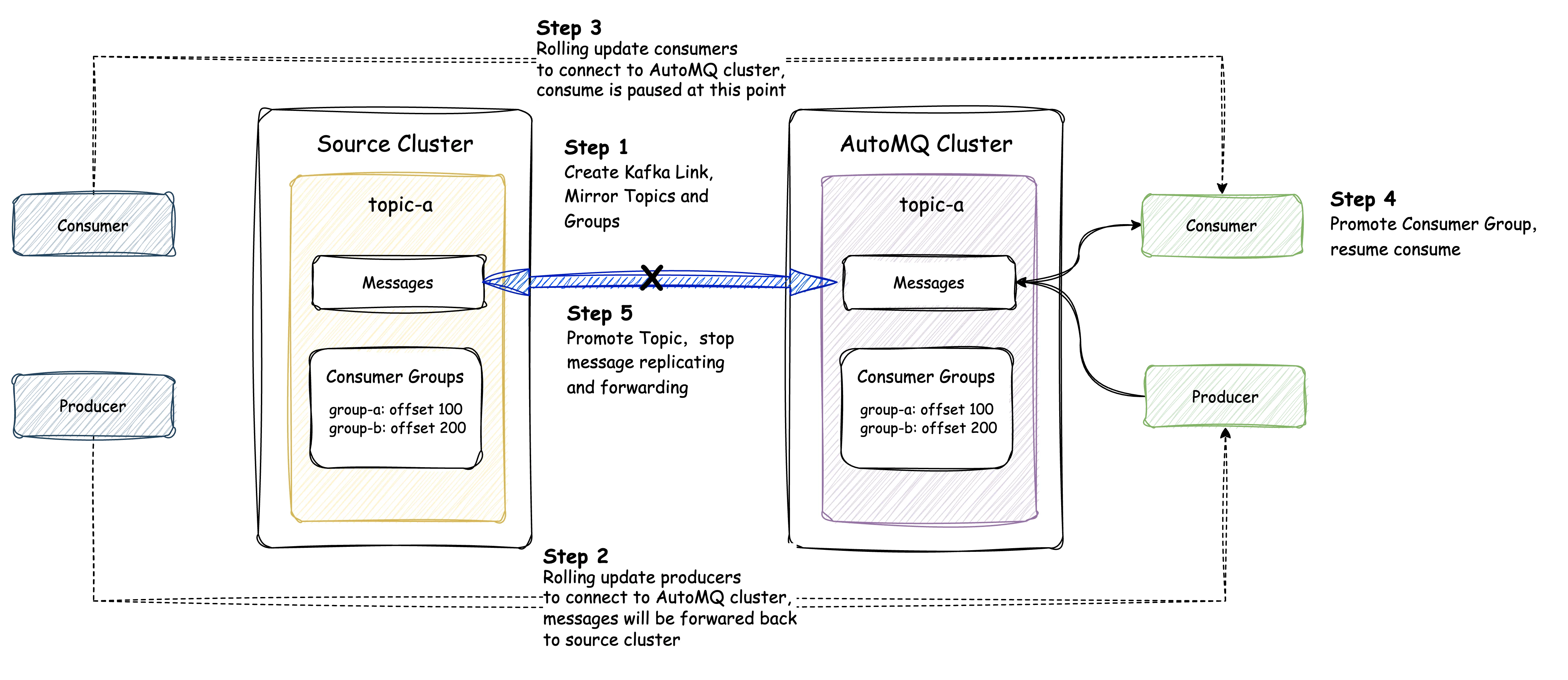 Seamless Producer Migration: During the migration, data produced to the new AutoMQ cluster is automatically forwarded to the original source cluster. This unique capability means producers can be migrated first without affecting consumers that are still connected to the old cluster. It ensures a consistent, ordered stream of data is available to all consumers, regardless of which cluster they are pointing to.