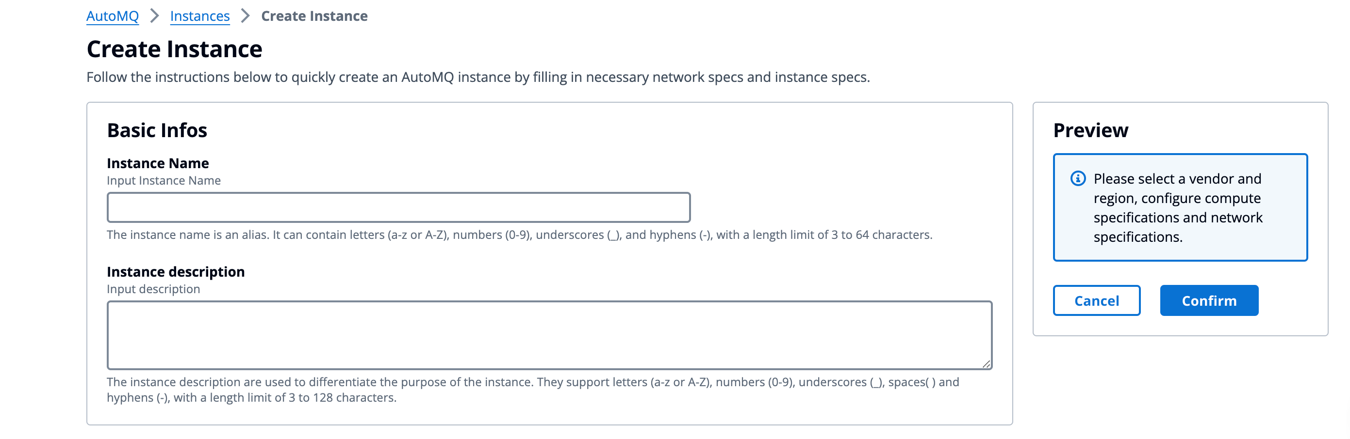 To get started with AutoMQ, you first need to create an instance, which is equivalent to an open-source Apache Kafka cluster. You can create an instance using the web interface in the environment console. The console handles the provisioning of underlying cloud resources and the deployment of the instance software for you. Follow these steps:- Navigate to your environment console’s URL to open the console.