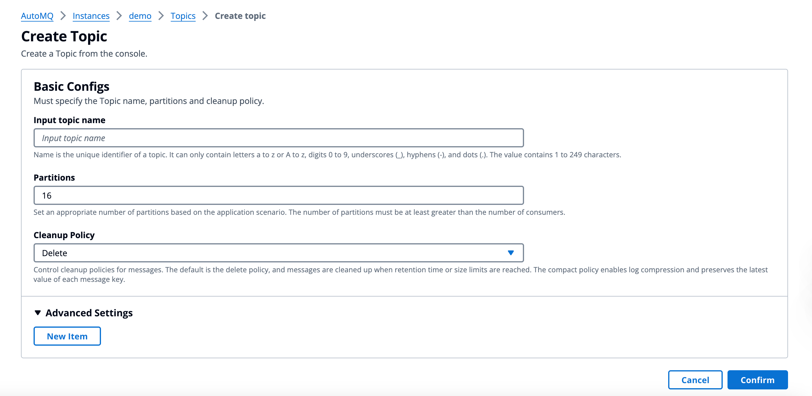 - Click Create New Topic, fill in the required parameters, and create the topic.