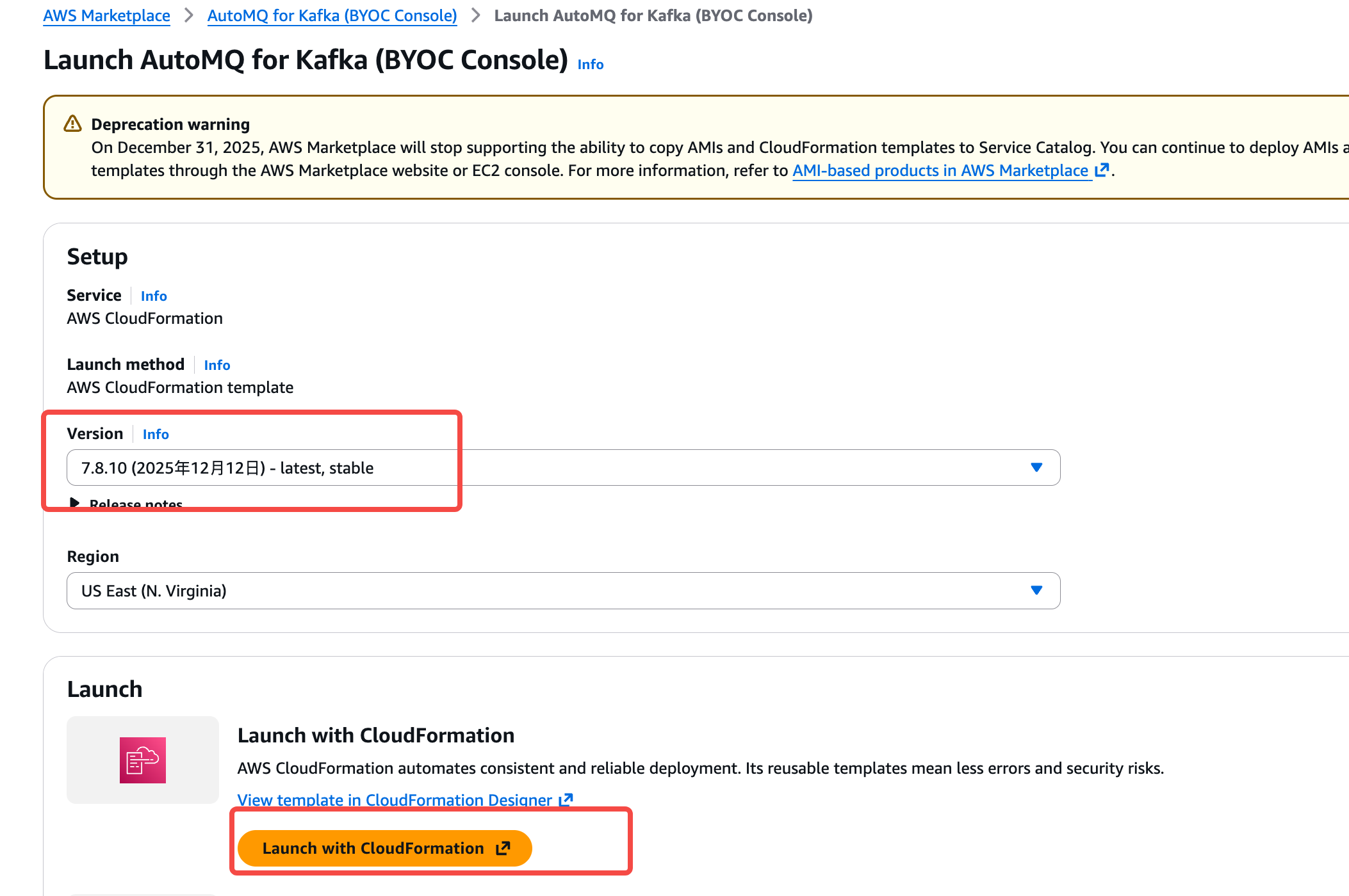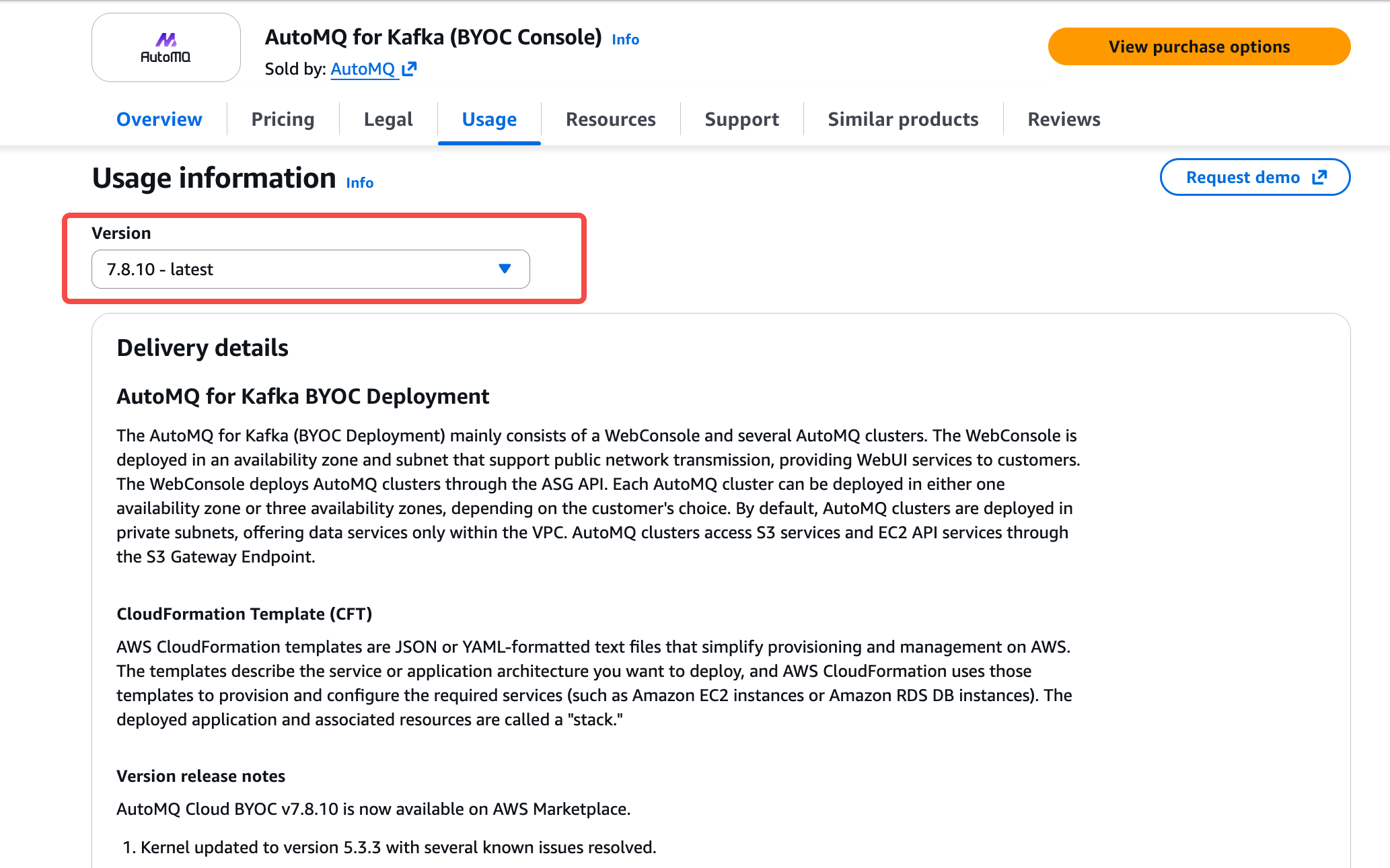 If your AutoMQ Cloud BYOC environment is older than version 8.0 and was installed via Marketplace CloudFormation on AWS, then upgrading to an updated 7.x version also needs to be done via CloudFormation. Steps Log in to the cloud account associated with the Console or a sub-account with authorization capabilities, and navigate to the Marketplace Console.- Go to the Marketplace to check the latest version. Visit the AWS Marketplace product page, select the target version you wish to upgrade to; it is recommended to upgrade to the most recent ‘Latest’ version.