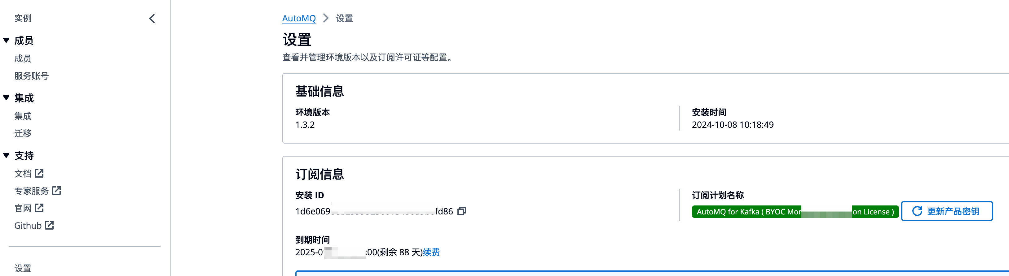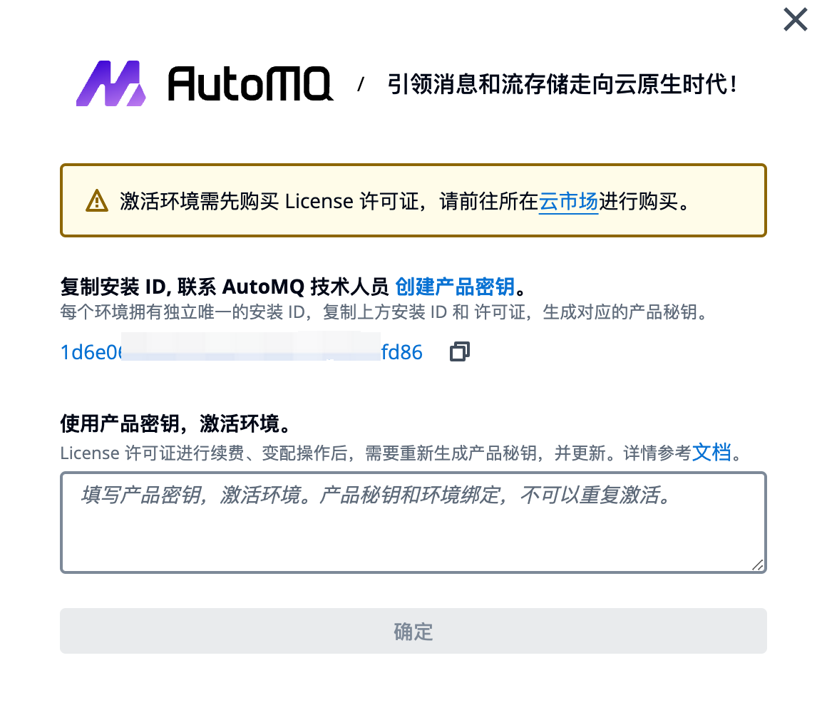 - 收集环境安装 ID ,配置前一步购买的 License 信息,联系 AutoMQ 技术人员获取激活用的产品秘钥 。
