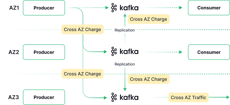 For consumers, AutoMQ's AZ Aware mechanism ensures consumption within the same AZ. For producers, S3's shared storage feature eliminates cross-AZ network costs during data transmission.